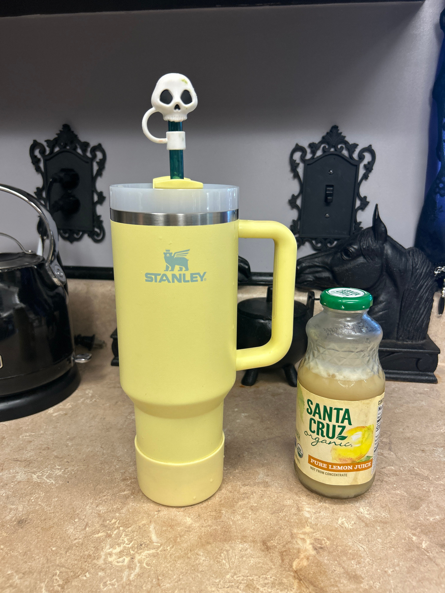 This indoor shot shows a yellow Stanley tumbler with a skull-shaped straw topper, a bottle of Santa Cruz Organic Pure Lemon Juice, and decorative black metal objects on a countertop. The countertop ha…read more