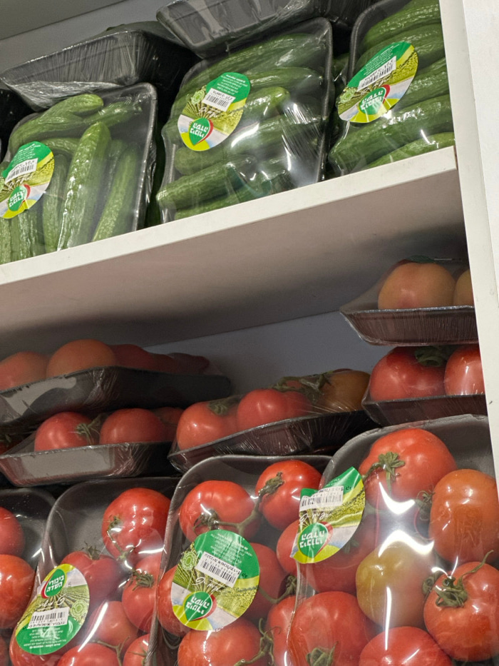 Packaged cucumbers and tomatoes are arranged side by side on shelves. The cucumbers, wrapped in clear plastic, are long and green, each package adorned with a green label. To their right, tomatoes are…read more