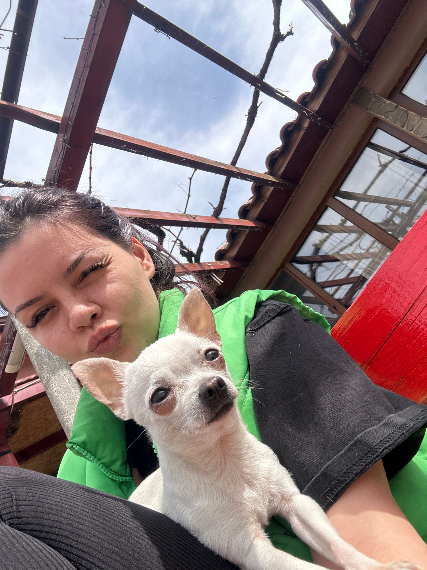 A woman poses for a selfie while holding a small, white dog in her lap. The woman has dark hair and is wearing a green jacket. The dog is looking directly at the camera with a curious expression. In t…read more