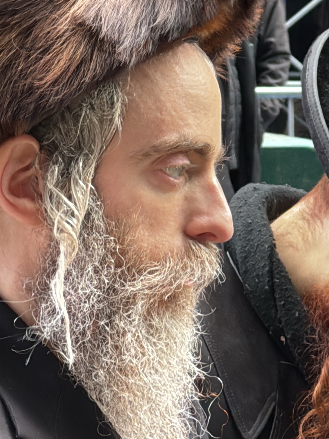 The image presents a close-up, right-profile view of an adult male in an outdoor setting within New York City, United States. He has fair skin, a prominent nose, and visible forehead wrinkles. He wear…read more