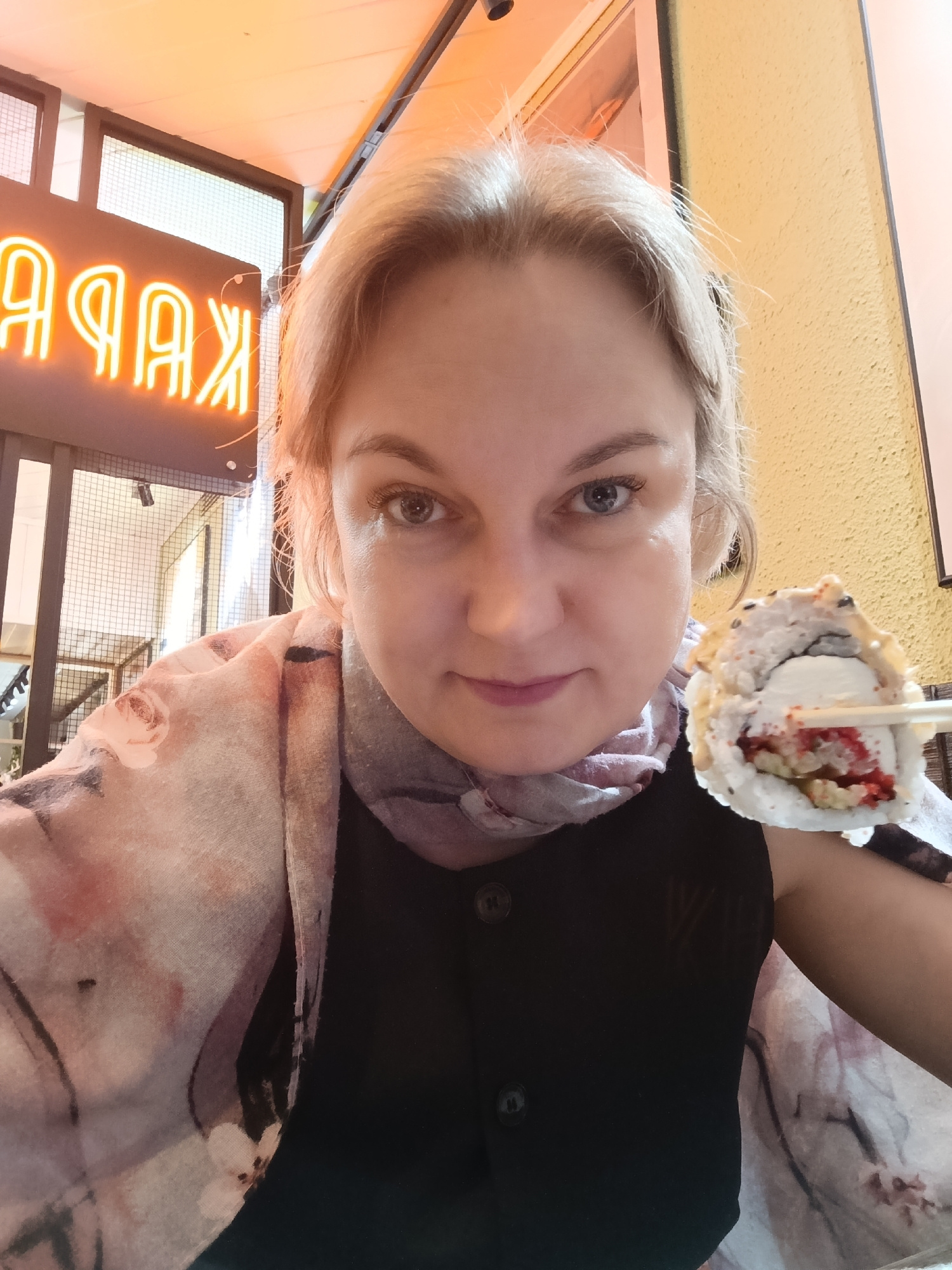 A woman with fair skin and light blonde hair takes a selfie in what appears to be an indoor dining establishment in Chaikovsky, Russia. She looks directly at the camera with a neutral expression. She…read more