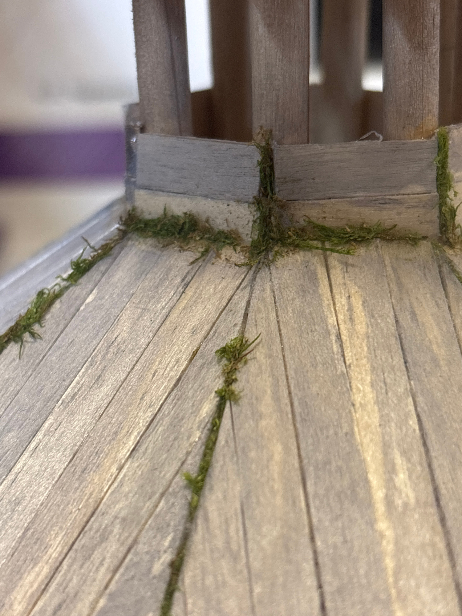 The image shows a close-up view of a model structure made from thin wooden slats, resembling a roof or wall. The slats are arranged in a fan-like pattern. Patches of green moss-like material are attac…read more