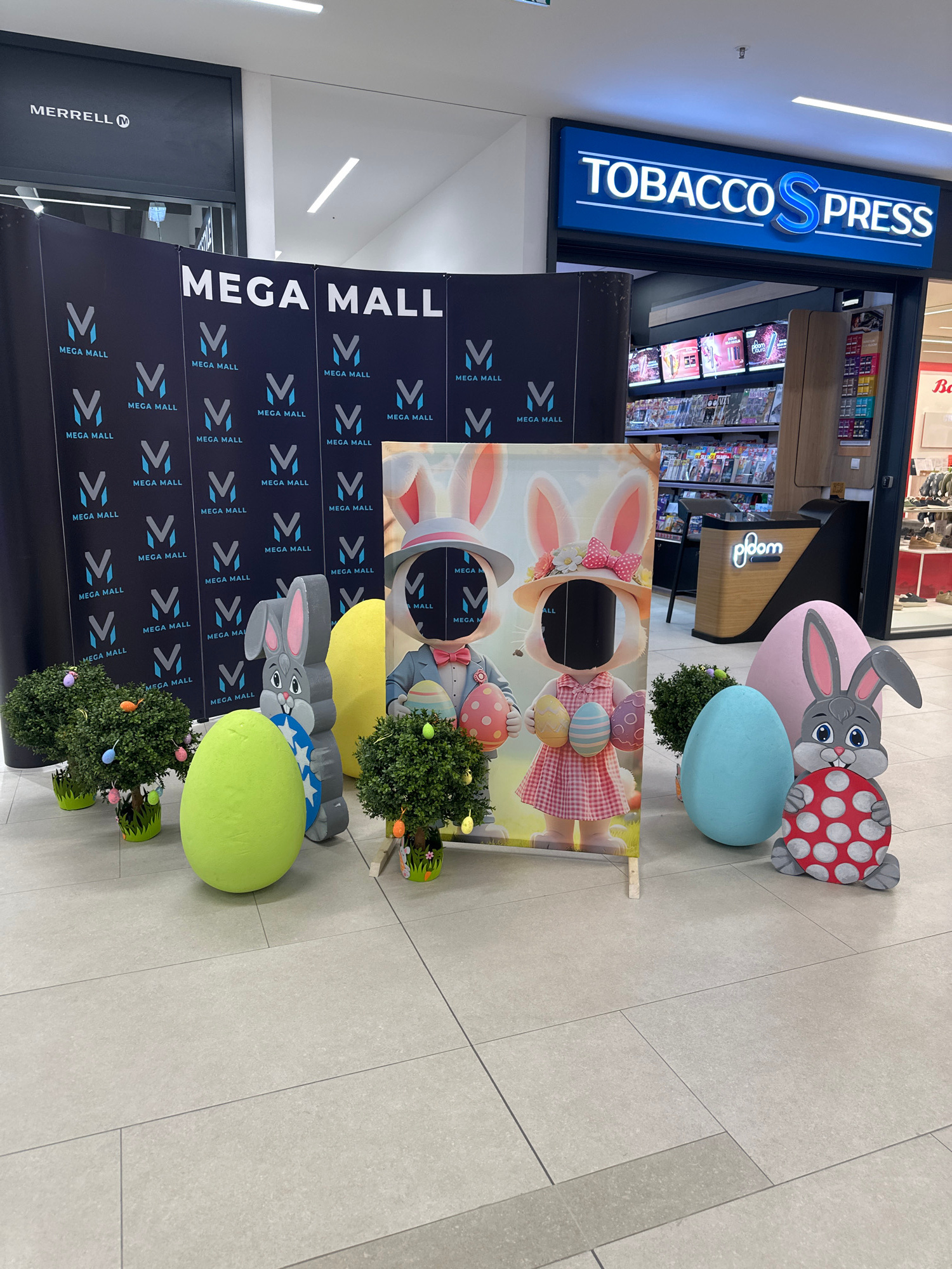 Here's a description of the image: The image shows an Easter-themed photo opportunity set up inside the Mega Mall in Budva, Montenegro. In the background, storefronts can be seen, including a "Tobacc…read more