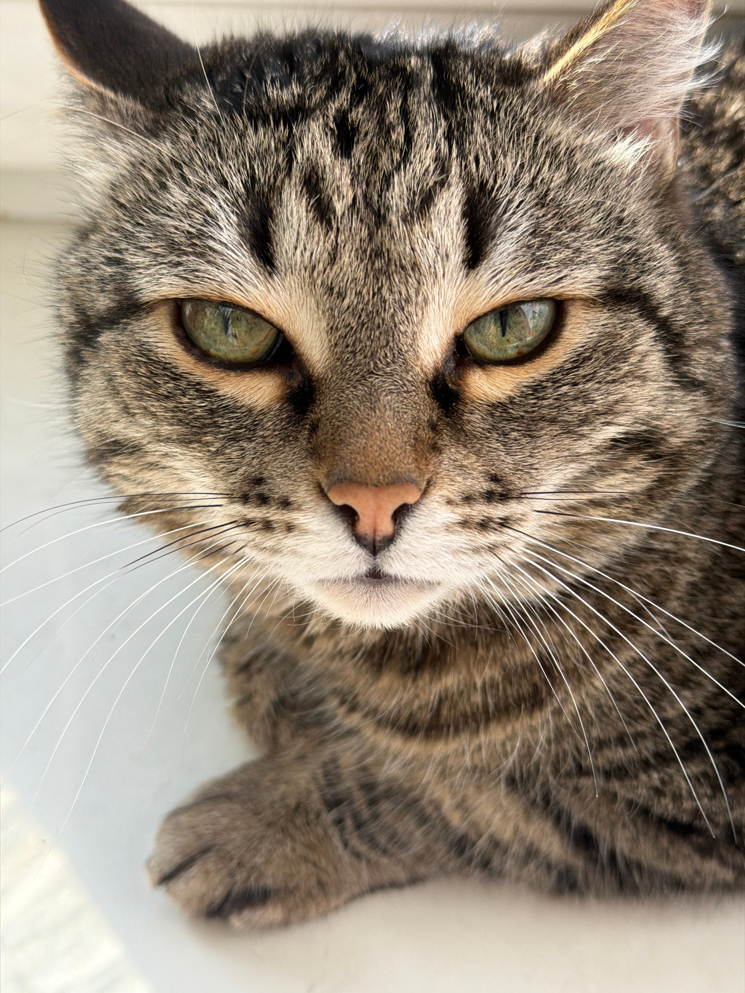 The image is a close-up of a tabby cat's face, showing its green eyes, pink nose, and long white whiskers. The cat has brown and gray striped fur. A paw is partially visible on the right side of the i…read more