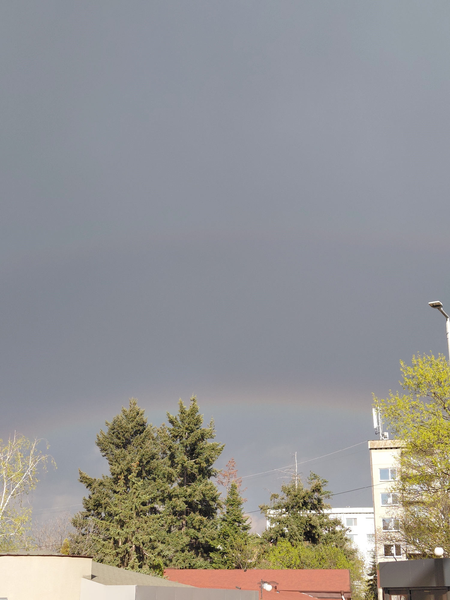 This media file presents an urban landscape captured under a predominantly grey and overcast sky. The image appears to be taken from a slightly elevated vantage point, possibly overlooking a street or…read more