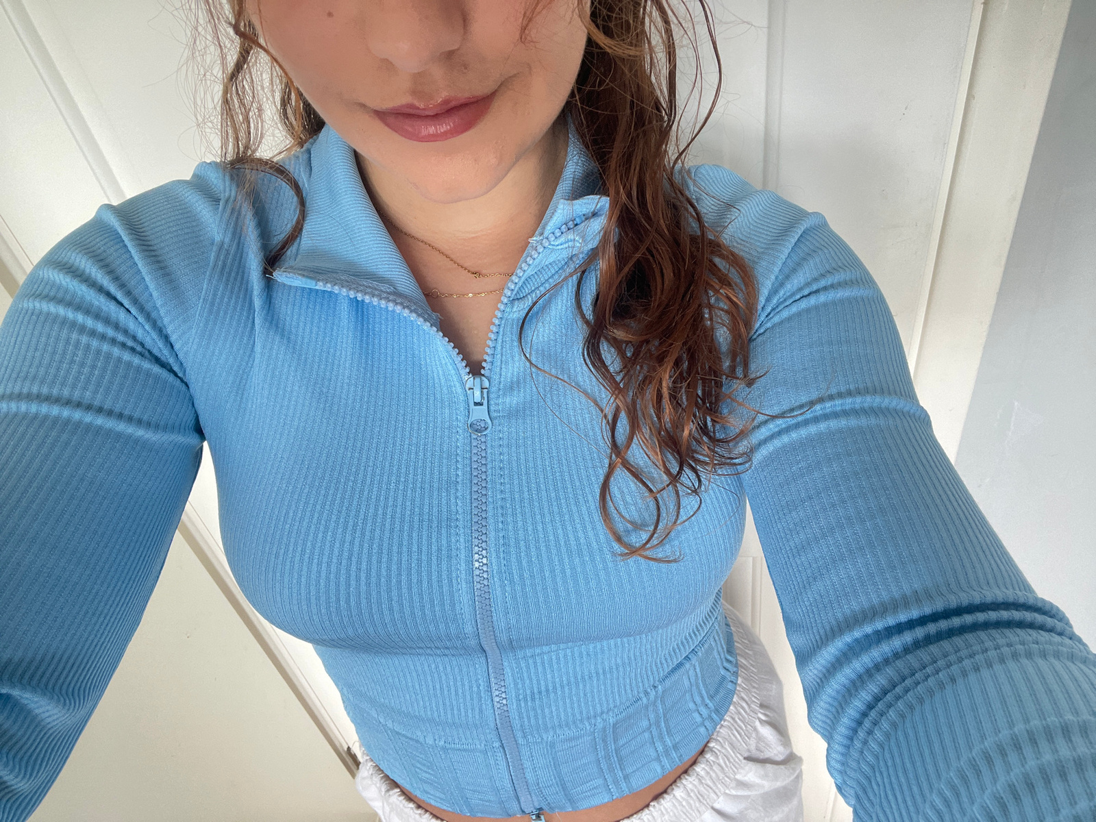The image is an upside-down, close-up perspective shot of a person wearing a light blue, ribbed long-sleeved top with a zipper down the front. The person's face is visible from the nose and mouth down…read more