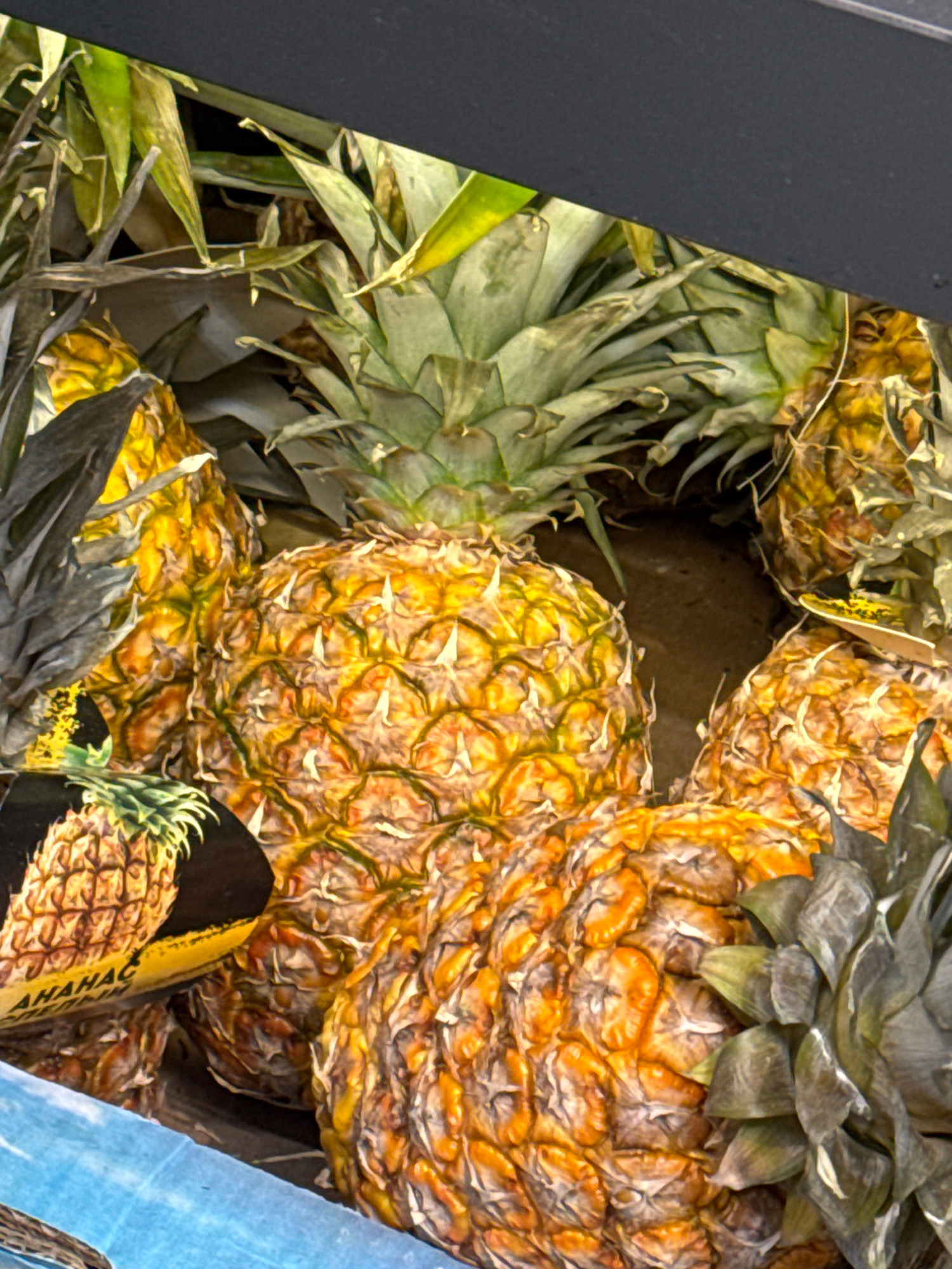 The image shows a pile of pineapples in what appears to be a market setting. The pineapples are various shades of yellow and orange, some with their green, spiky tops visible. There's also a can with…read more