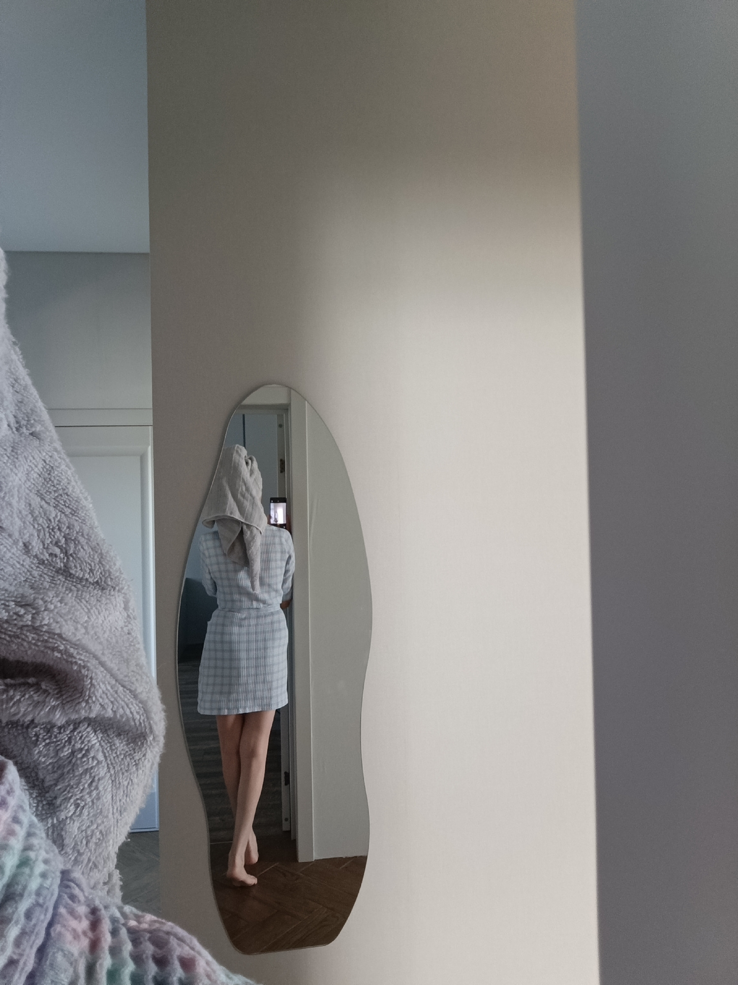 The image displays an indoor scene in Chaikovsky, Russia, featuring a person taking a mirror selfie. A lean individual, seen from behind, is reflected in an irregularly shaped, wavy-edged mirror. The…read more