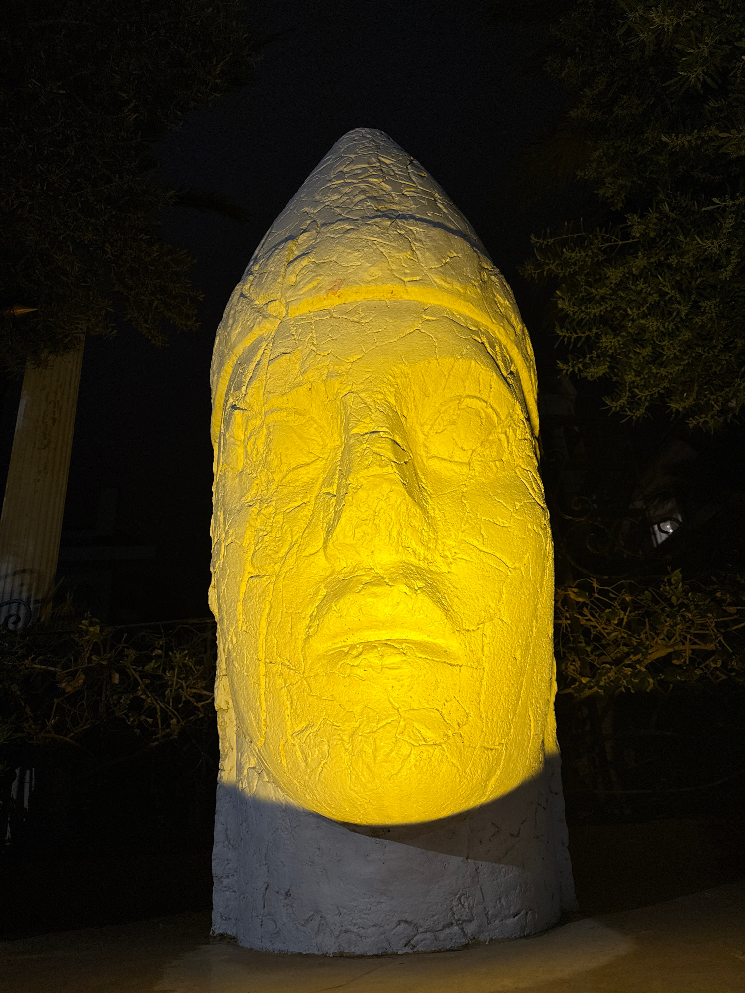 The image shows a large, yellow-painted concrete sculpture of a human head at night. The head has a smoothed, rounded form with visible facial features. A light source illuminates the right side of th…read more