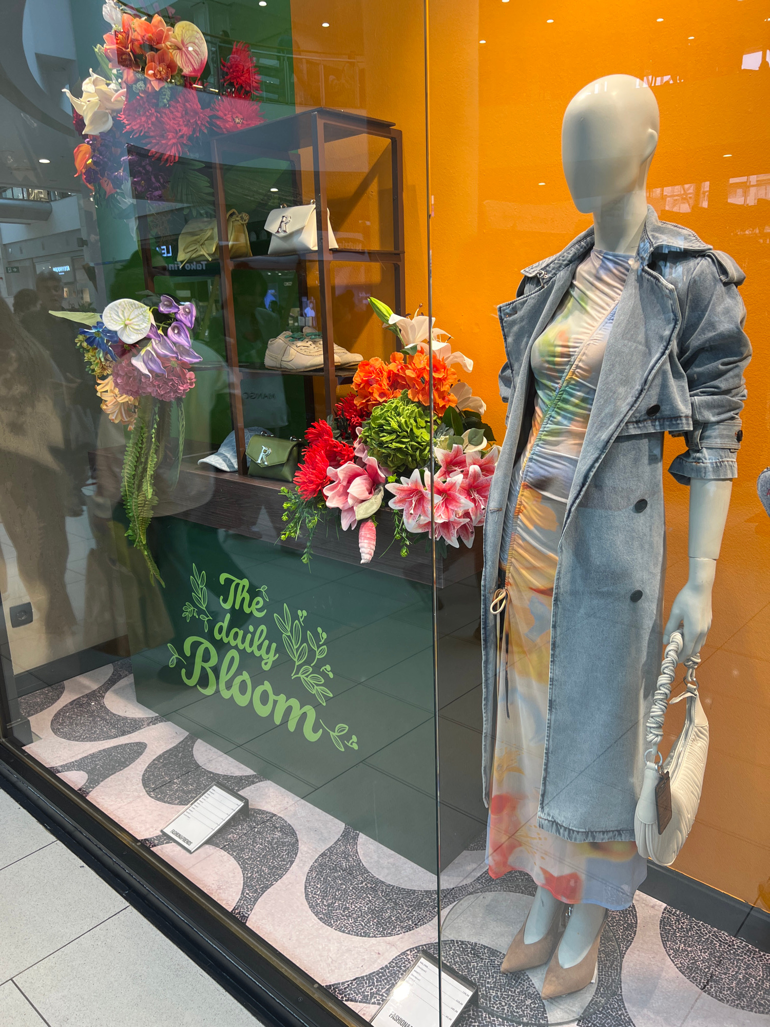 This is a retail store display window located within a shopping mall in Podgorica, Montenegro. The display features a headless, white female mannequin on the right, dressed in a multi-colored, ruched…read more