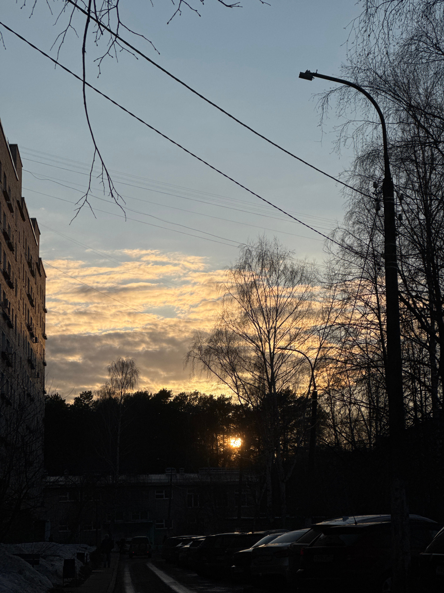 The image depicts a cityscape in Chaikovsky, Russia, during what appears to be a sunset or sunrise. In the foreground, a brick building partially obscures the view. Above, the sky is filled with layer…read more