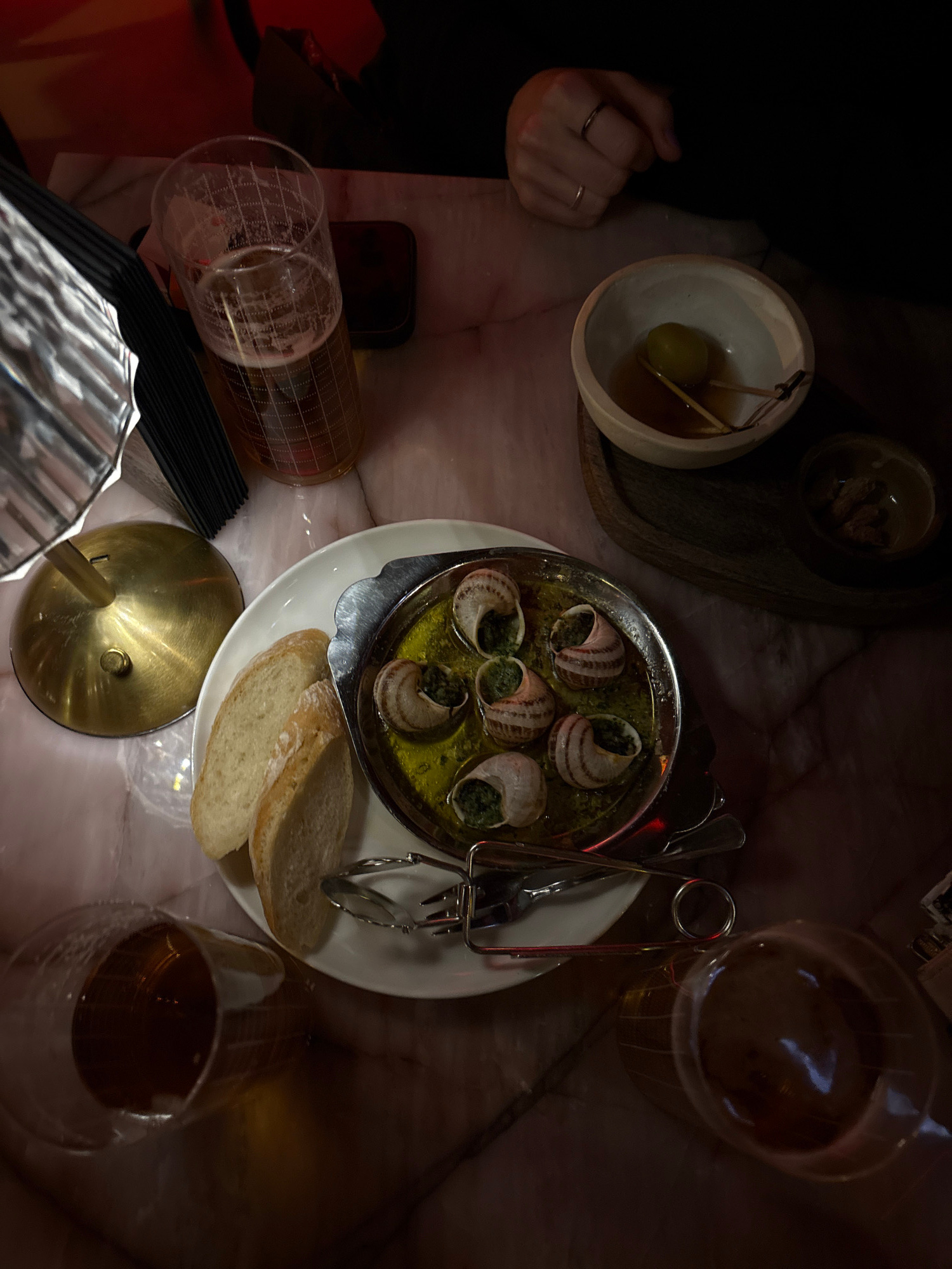 The image depicts a restaurant table setting, possibly in Moscow, Russia (deduction based on likely cuisine and objects). A person's hand with a wedding ring is visible on the left. Dishes include esc…read more