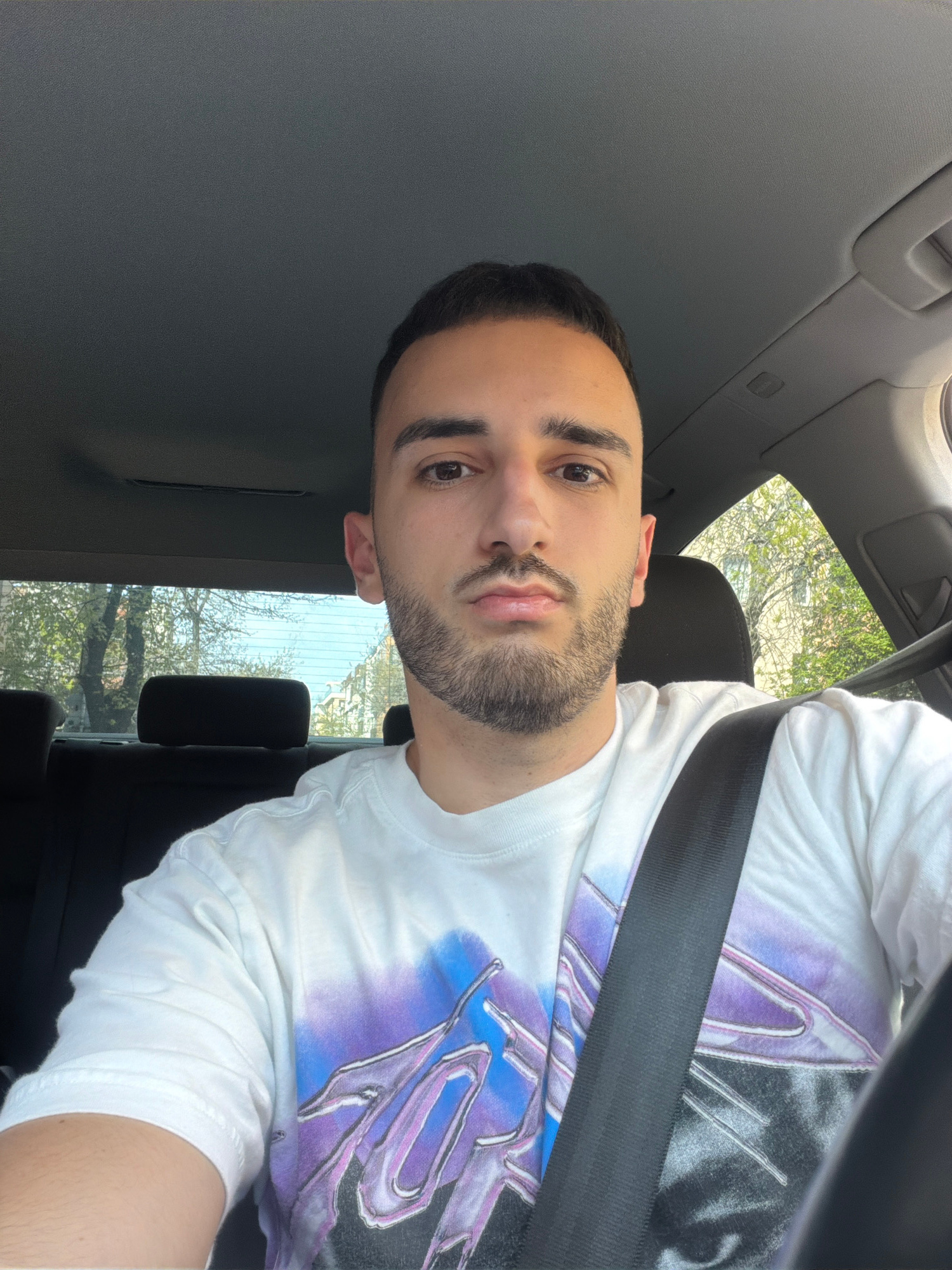 A man is seated in the driver's seat of a car, wearing a white t-shirt with a graphic design and a seatbelt. Outside the car window, trees are visible. The location cannot be determined from the image…read more