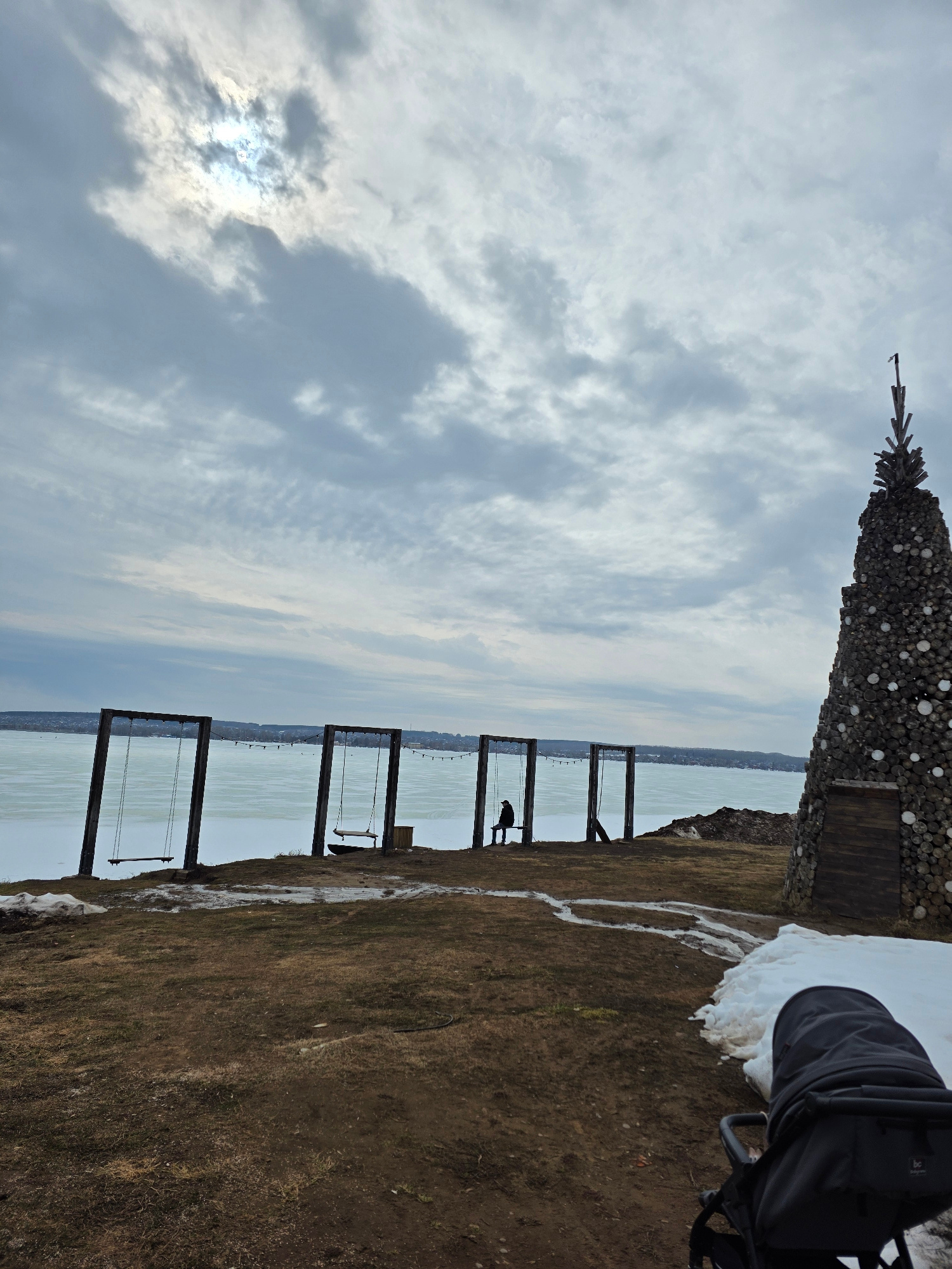 The image captures a scene at the Votkinsk Reservoir in Votkinsk, Russia. The day is overcast, with a cloudy sky and the sun partially obscured. The reservoir extends into the horizon. Along the shore…read more