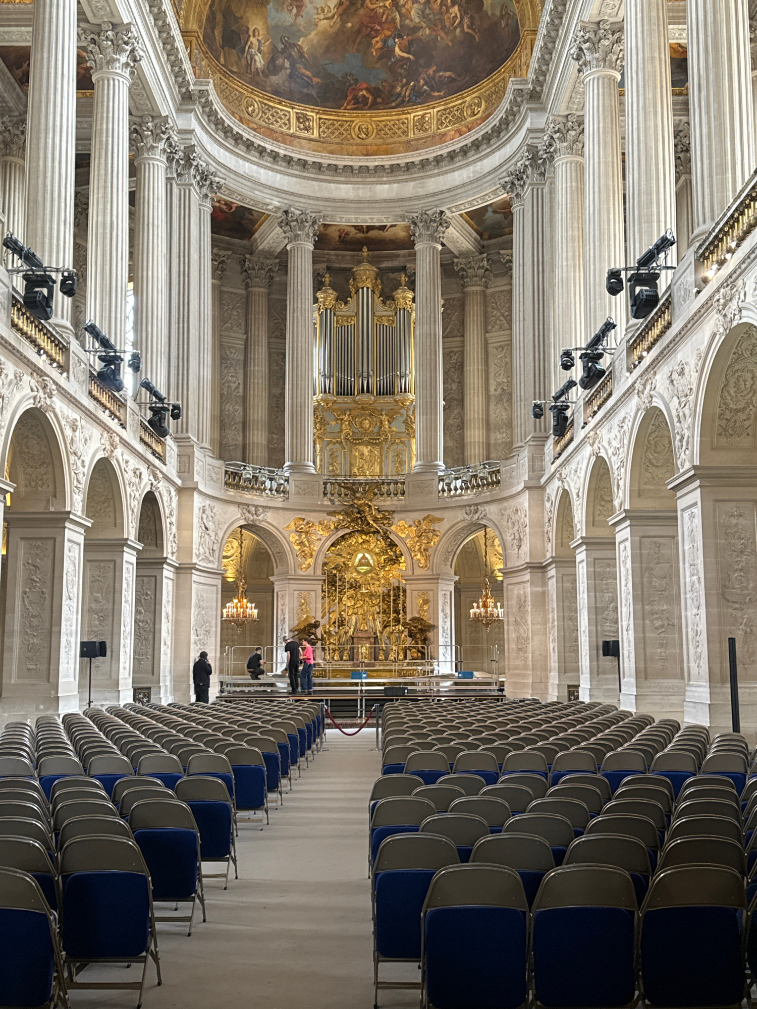 The image depicts the interior of the Royal Chapel in the Palace of Versailles, France. The architecture is predominantly white and gold, with ornate decorations. A large organ sits prominently in the…read more