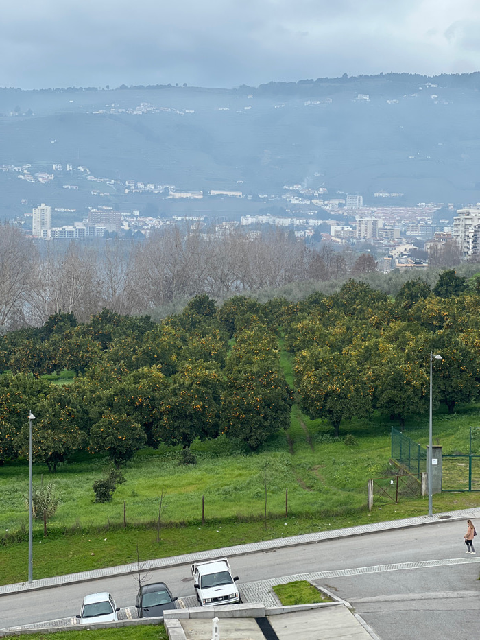 This image captures a panoramic view of Peso da Régua, Portugal, under an overcast sky with hazy distant visibility. The background features multiple layers of hazy, verdant hills, populated by scatt…read more