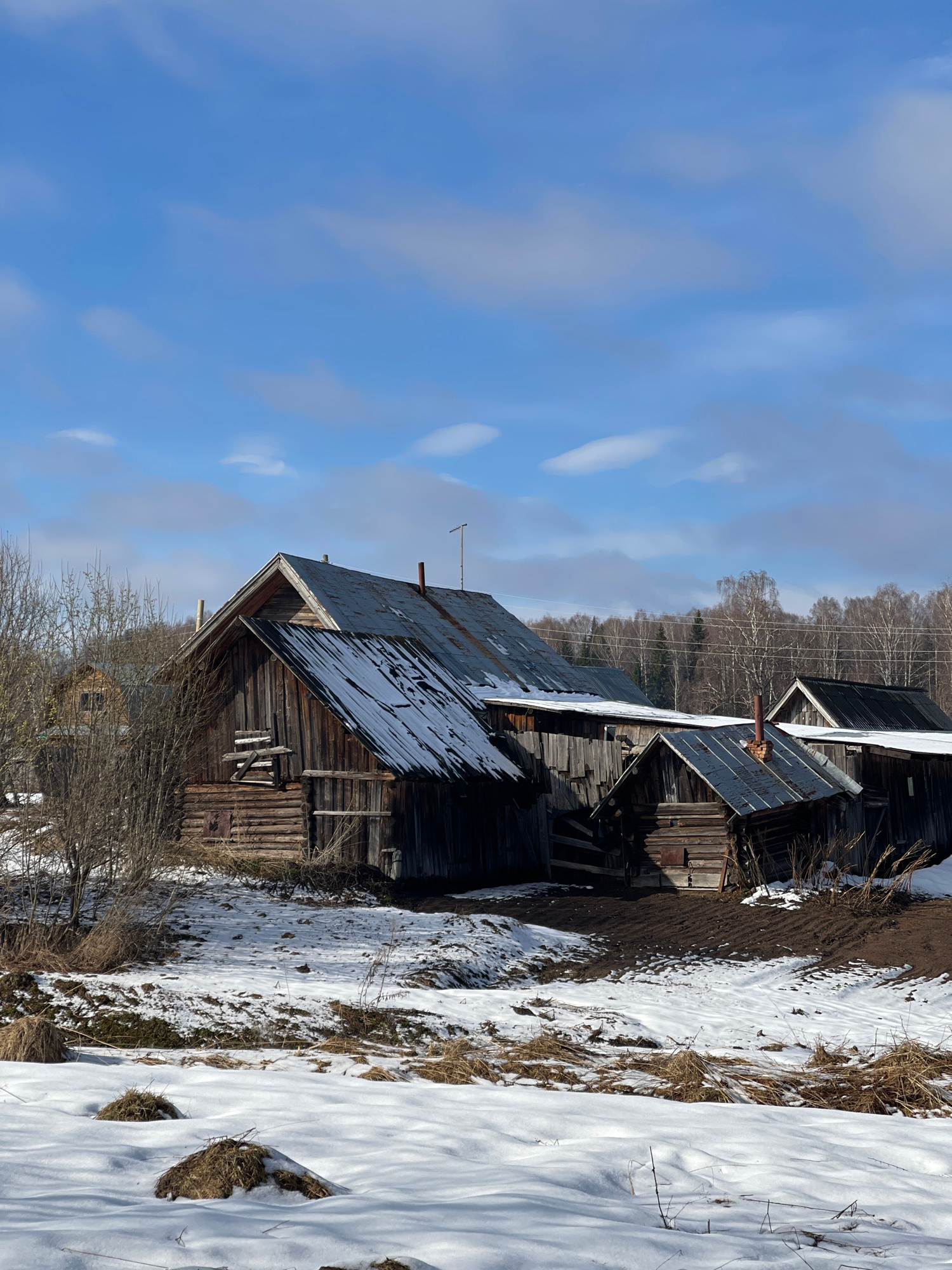 The image depicts a rural scene with several dilapidated wooden structures, likely barns or outbuildings, in what appears to be a state of disrepair. The location is identified as Zhigalki, Russia. Pa…read more