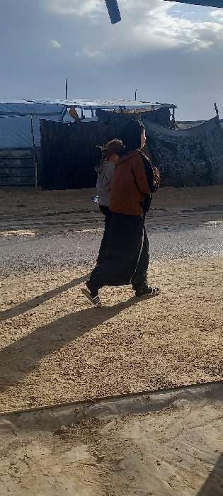 The image depicts an outdoor scene in Khan Yunis, Palestinian Territory, under a partly cloudy sky. Two individuals walk from left to right across a light brown, sandy ground with visible wet patches…read more