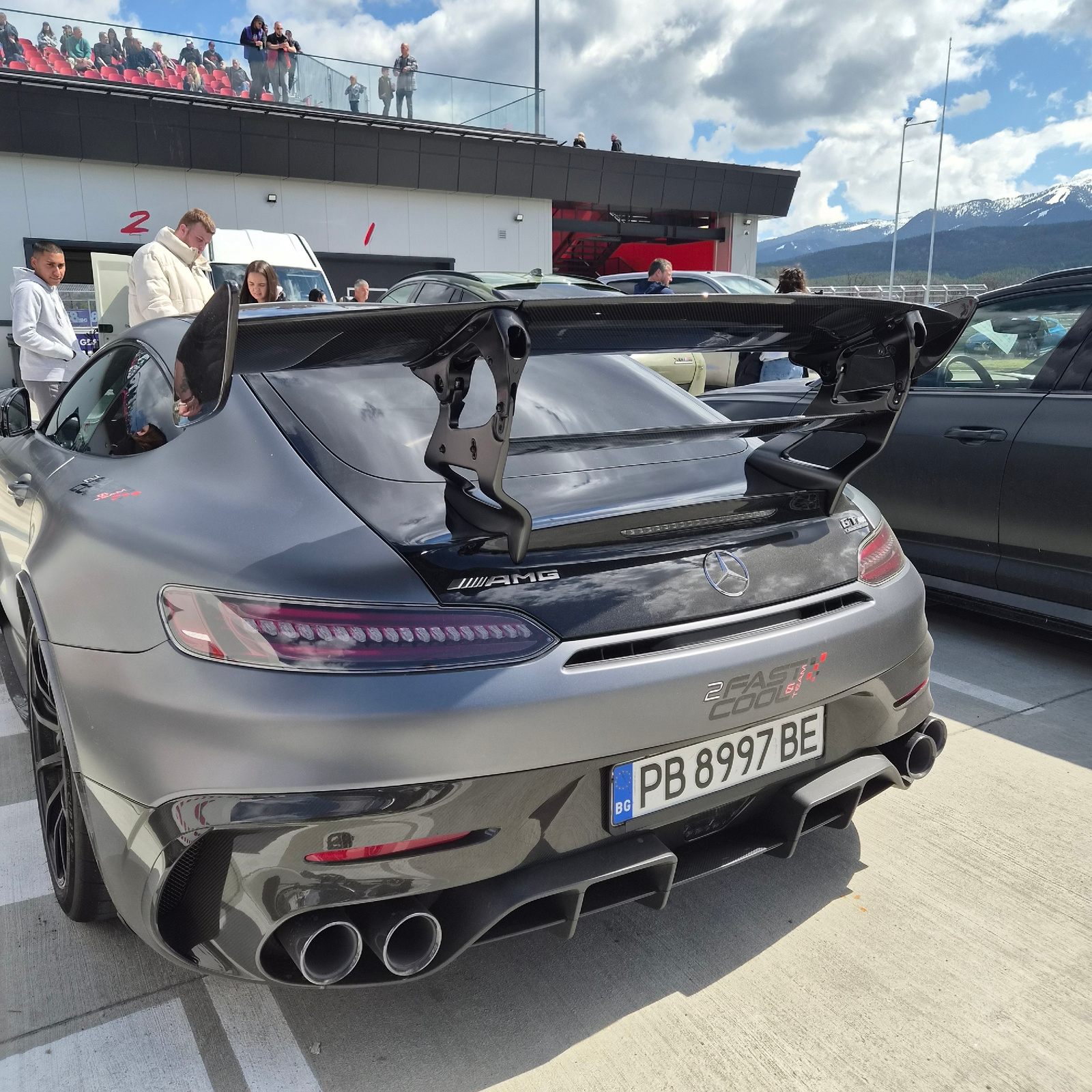 The image shows the rear of a gray Mercedes-AMG car parked on a concrete surface, with the rear wing prominently displayed. The license plate reads "PB 8997 BE" and indicates that the car is registered in Bulgaria. The words "2FAST2COOL TEAM" are visible as a sticker on the car. In the background, there's a building with people looking over a railing, a crowd seated in red chairs, and mountains in the distance. The scene appears to be at a racetrack or motorsports event. Based on the provided information that the location is Samokov, Bulgaria, the mountains are likely part of the Rila mountain range. People are standing around the car, some looking at it, suggesting they are observing or admiring it. There is another car parked next to the AMG. | Open Wire