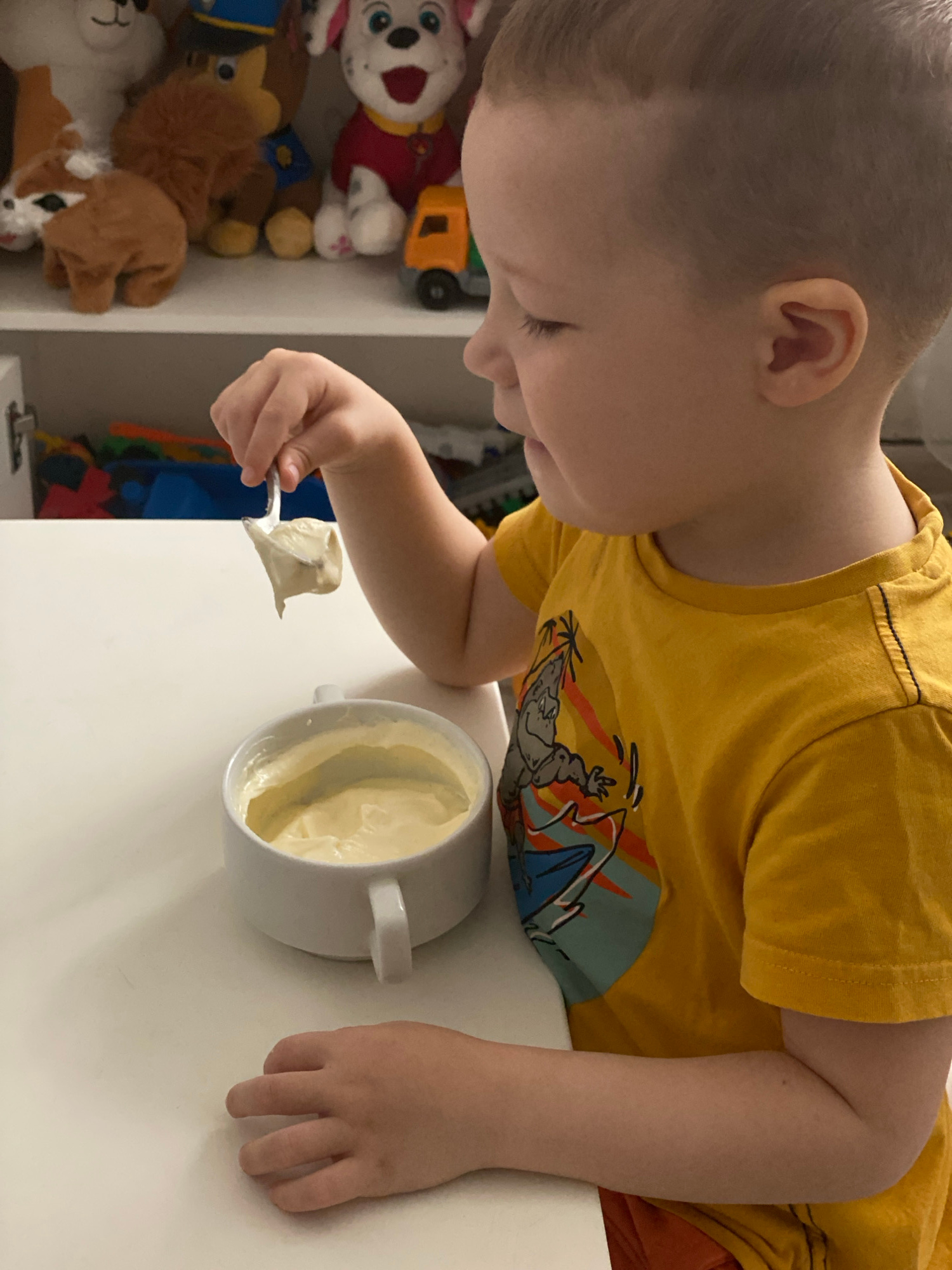 A child wearing a yellow t-shirt with a graphic design is holding a spoonful of what appears to be cream cheese or a similar spread. The child is positioned near a white bowl containing more of the sa…read more
