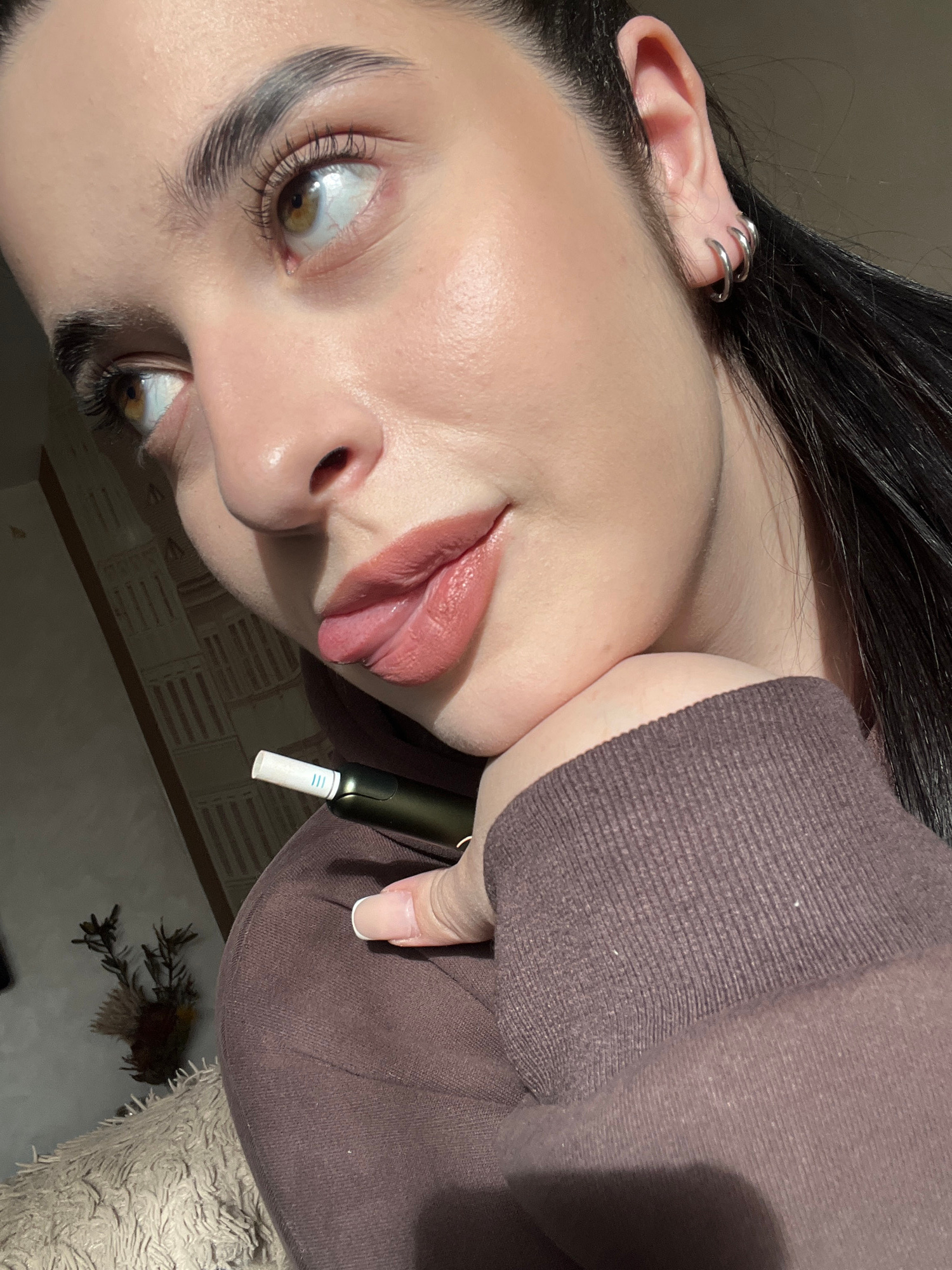 A person, likely female, is visible from the shoulders up, tilted to the left in the frame. She is holding a green and white electronic device with her right hand, near her face. Her dark hair is pull…read more