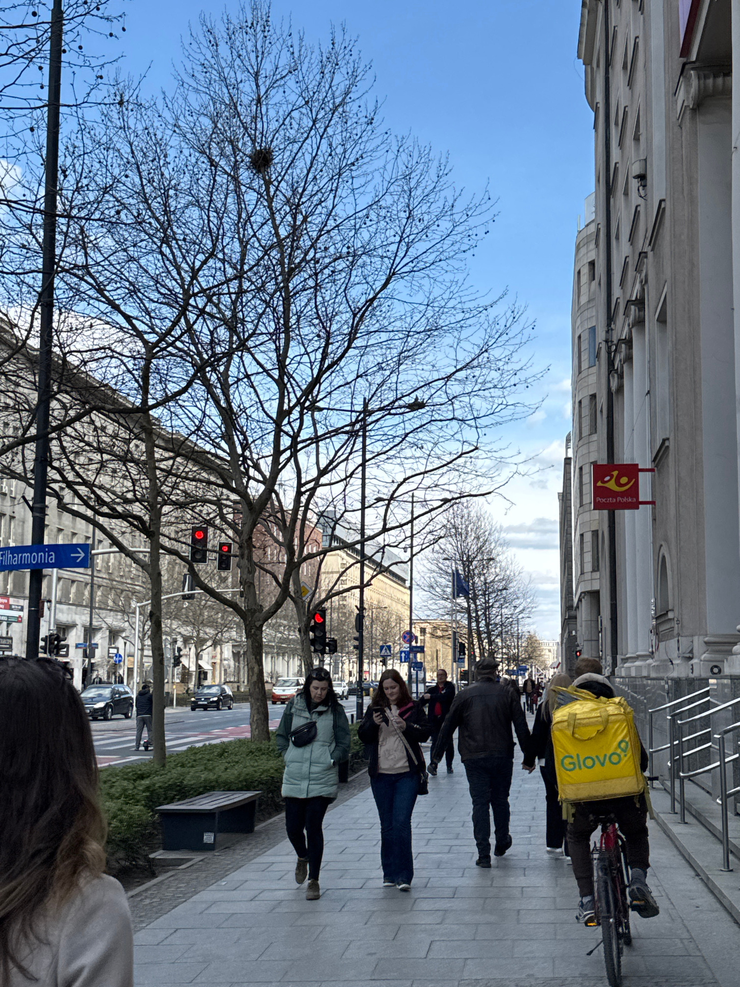 The image shows a street scene in Warsaw, Poland. Pedestrians are walking on the sidewalk, including a delivery person with a Glovo bag on a bicycle. A tree without leaves dominates the foreground, fe…read more