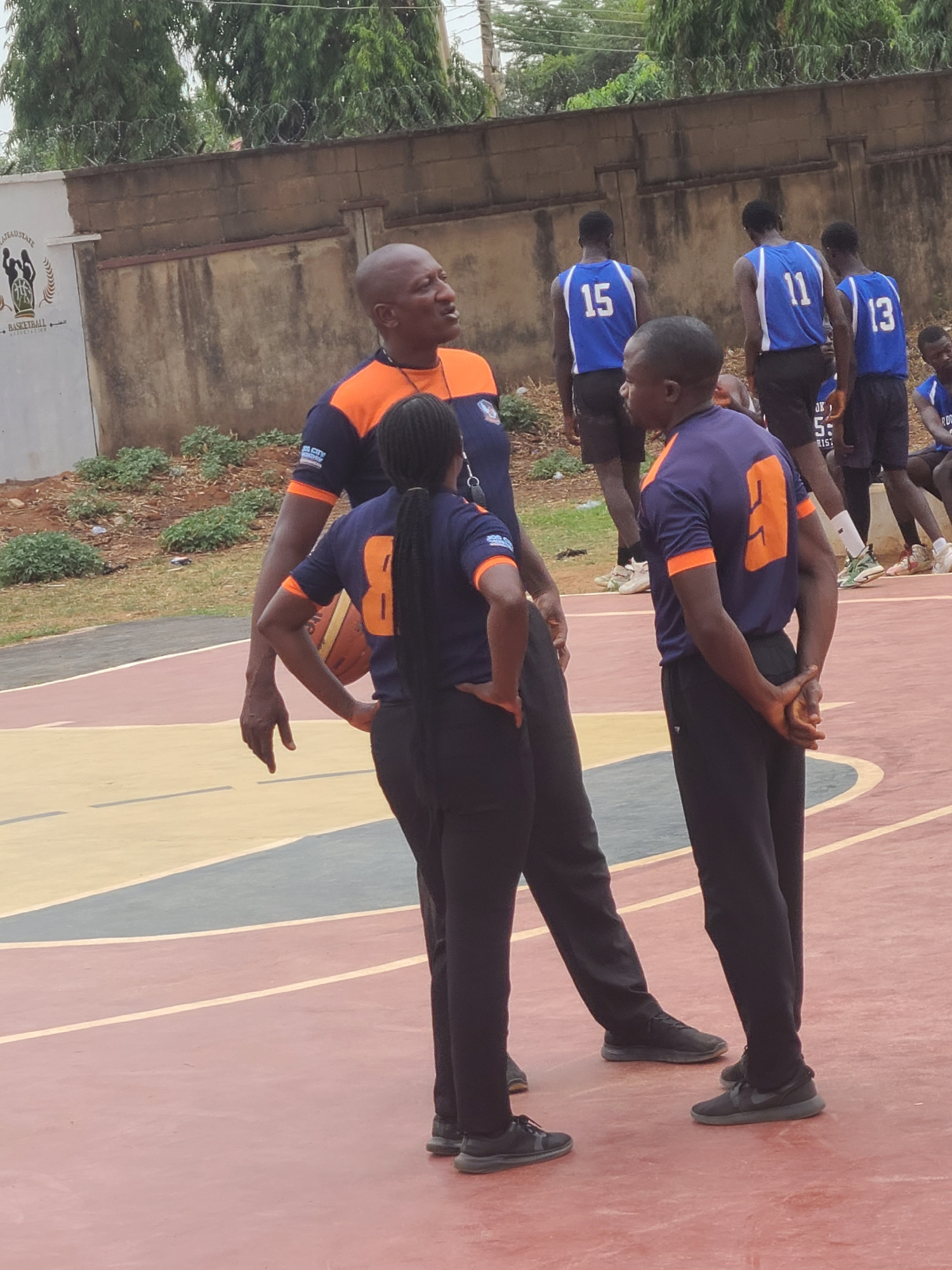 A row of individuals is captured on a basketball court, the location identified by an inscription on a nearby building indicating "Jos City Basketball Association", thus situating the scene in Jos, Ni…read more