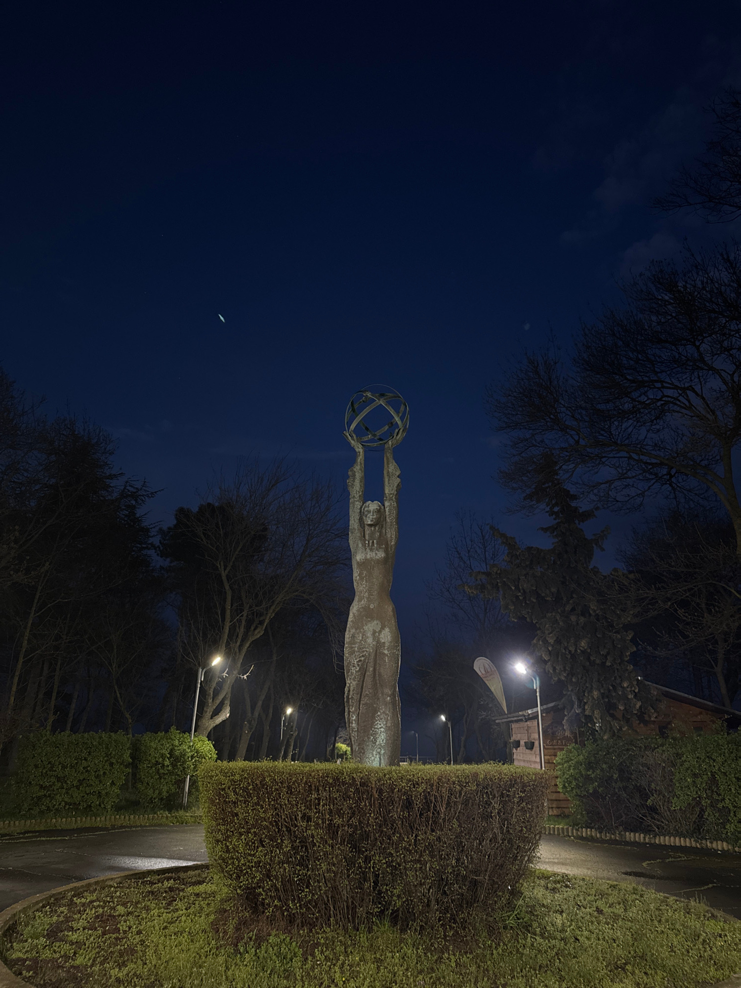 The image shows a statue in Tsarevo, Bulgaria, at night. The statue depicts a human figure holding a sphere above its head. The sky is dark blue, and there are bare trees surrounding the statue. A nea…read more