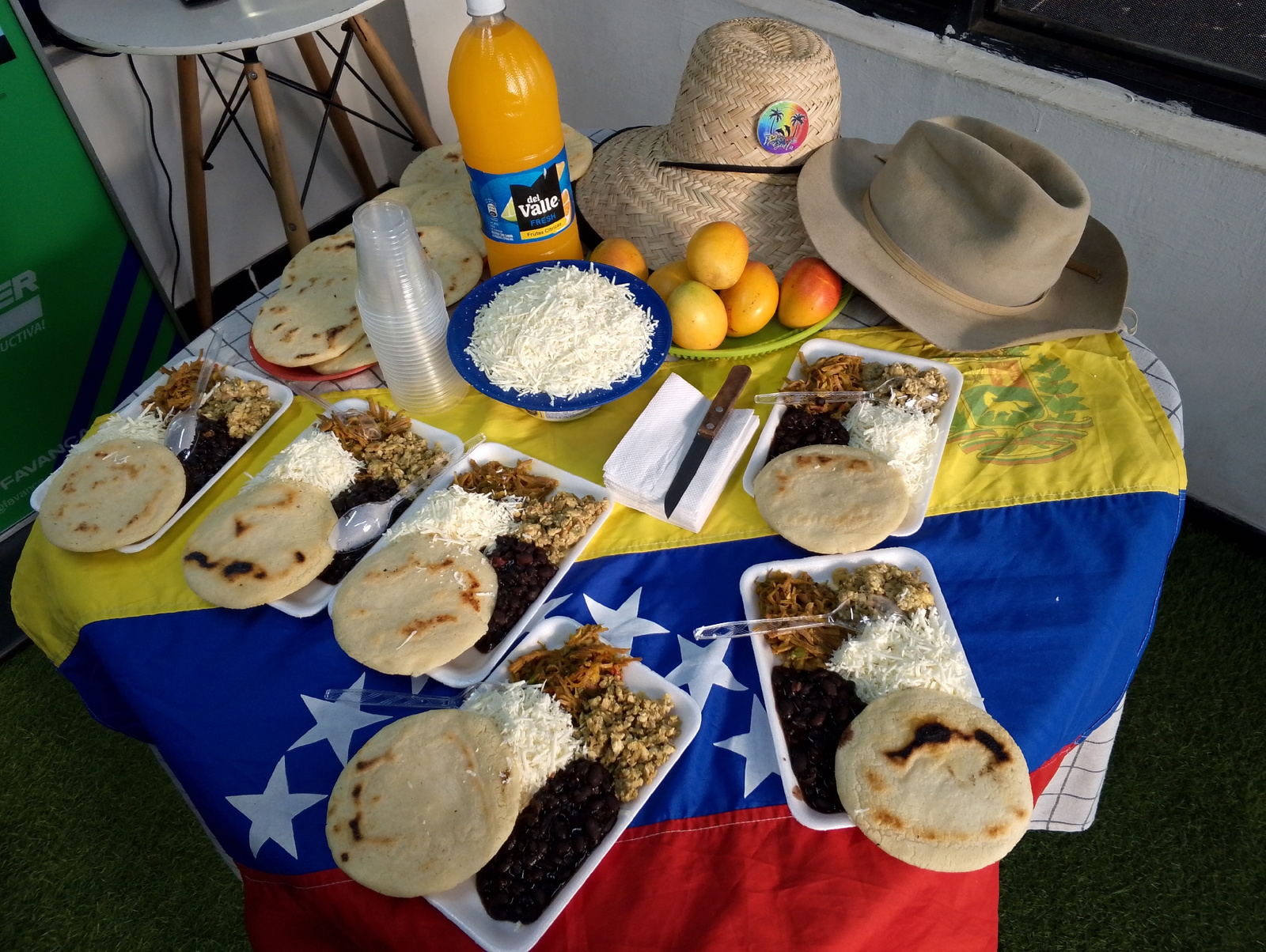 The image depicts a table laden with food items associated with Venezuelan cuisine, set against the backdrop of the Venezuelan flag. Several plates contain arepas, filled with black beans, shredded ch…read more