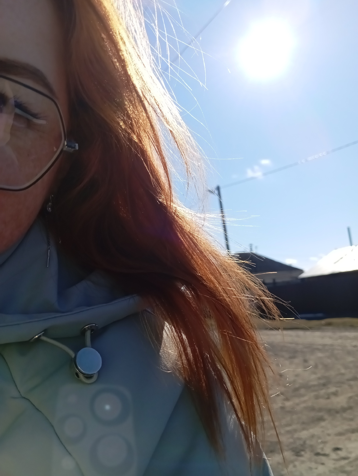 The image shows a close-up, tilted view of a person outdoors in Yurgamysh, Russia. The sun is shining brightly in a blue sky. Part of the person's face, including an eye with glasses, is visible. They…read more