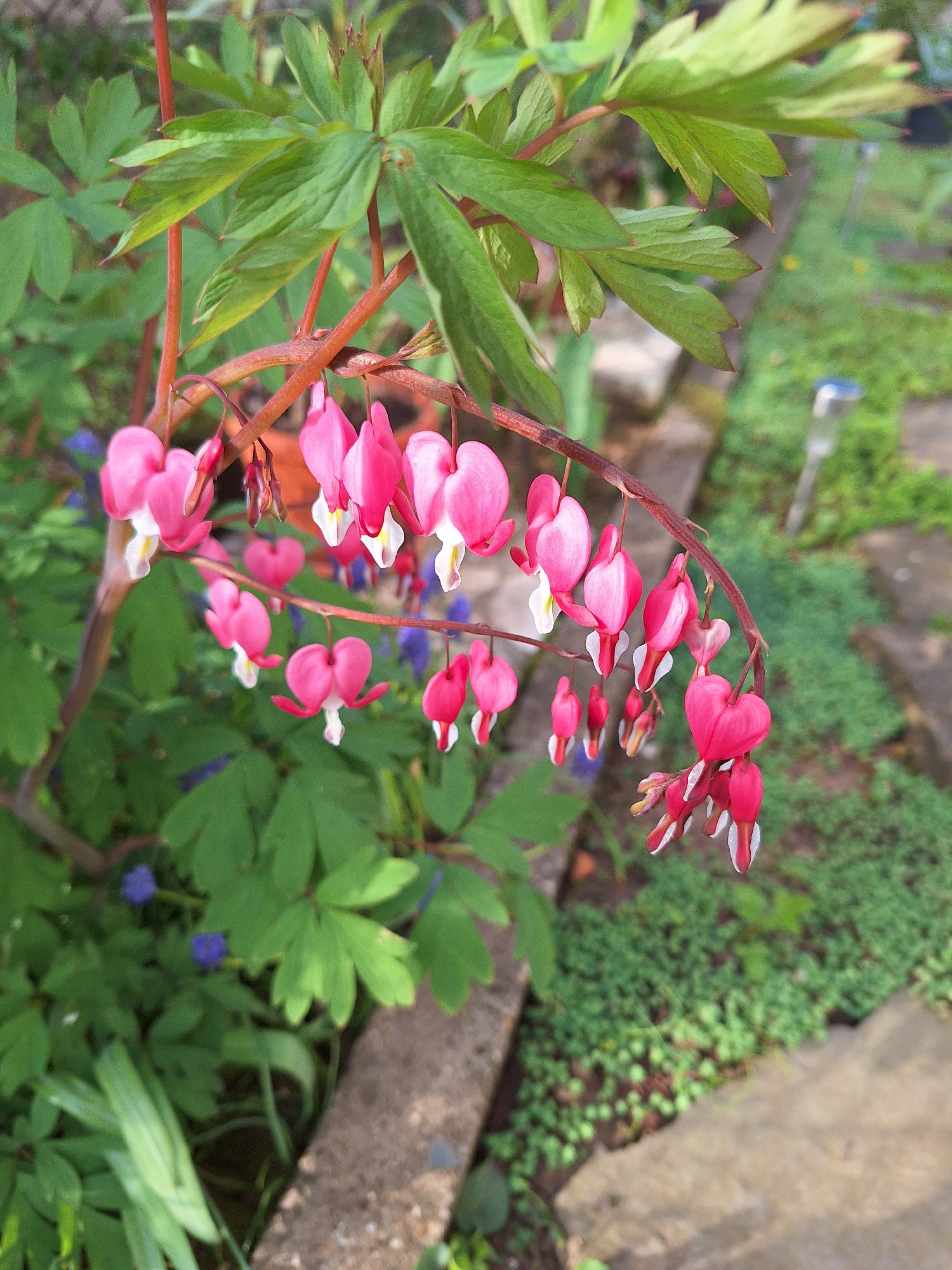 A close-up photograph depicts a plant of Bleeding Hearts (Dicentra spectabilis), with heart-shaped, pink-and-white flowers hanging from a reddish-brown stem. The plant is surrounded by green foliage o…read more