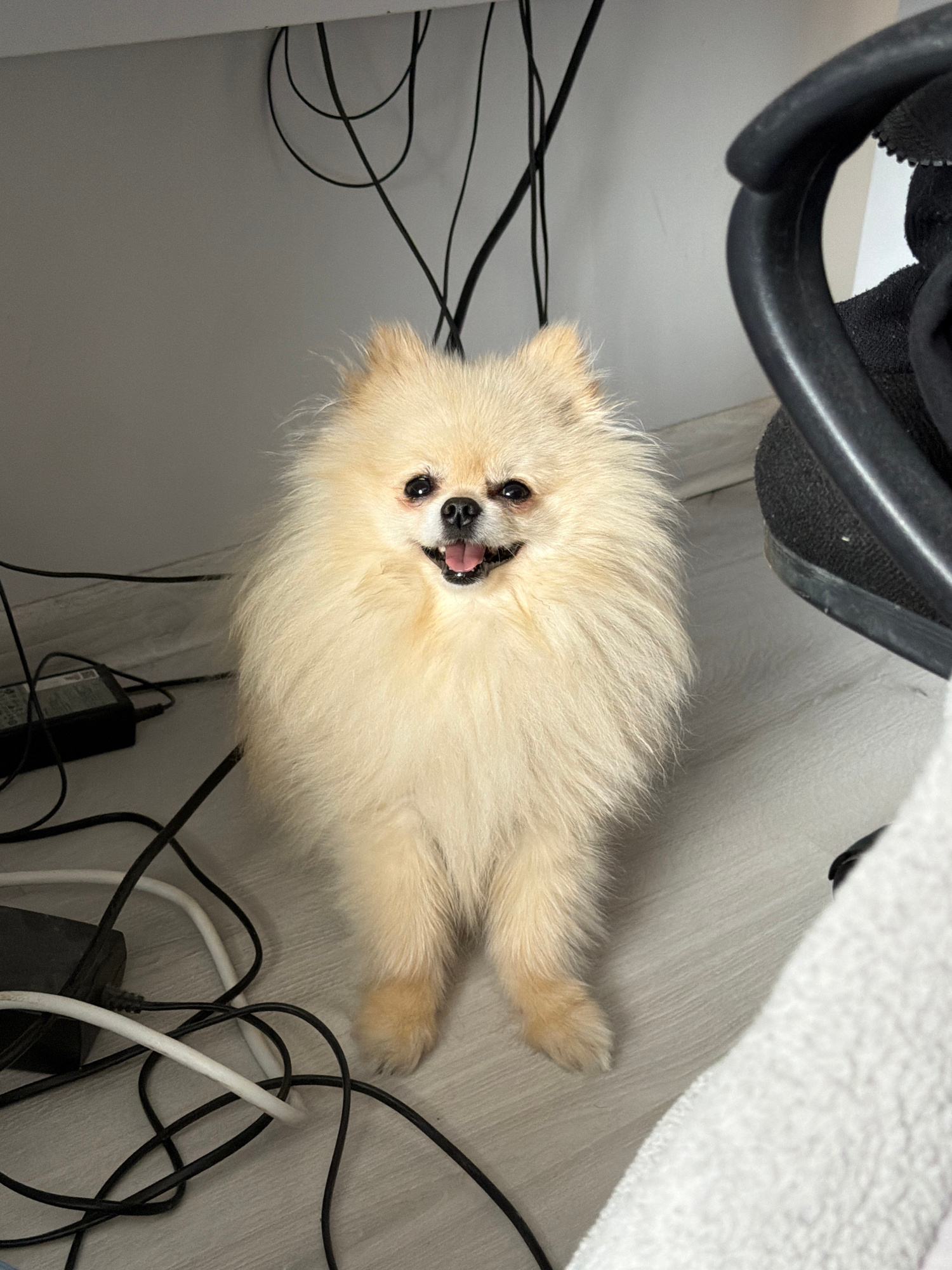 A cream-colored Pomeranian dog lies on a light grey floor next to a black office chair and a tangle of black and white computer cables. The scene is indoors and could possibly be located in an officeβ¦read more