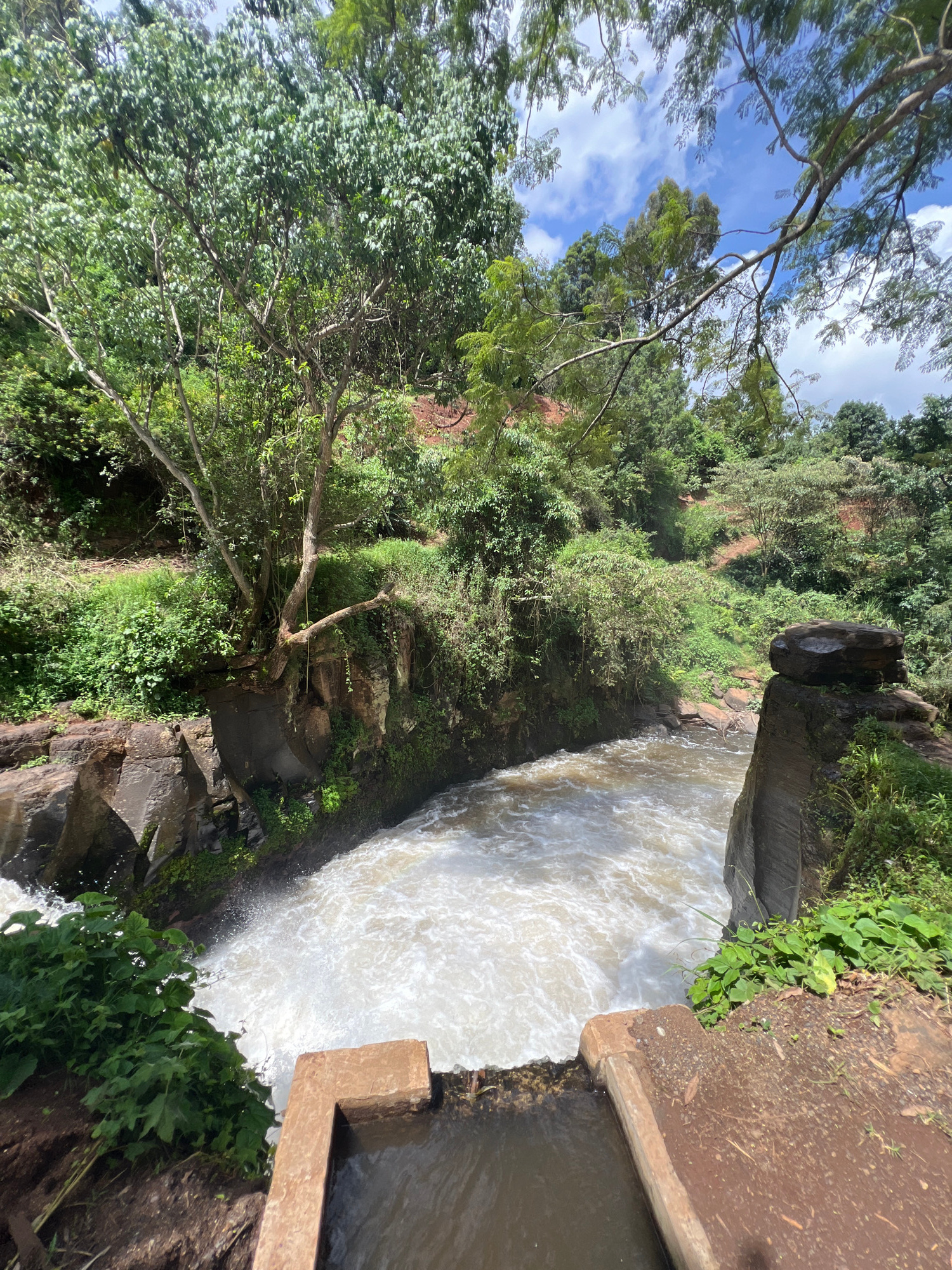 The image shows a high-angle view of Chania Falls, located in Nyeri, Kenya. Water cascades down a rocky precipice into a pool below. The waterfall is flanked by lush green vegetation, including trees…read more