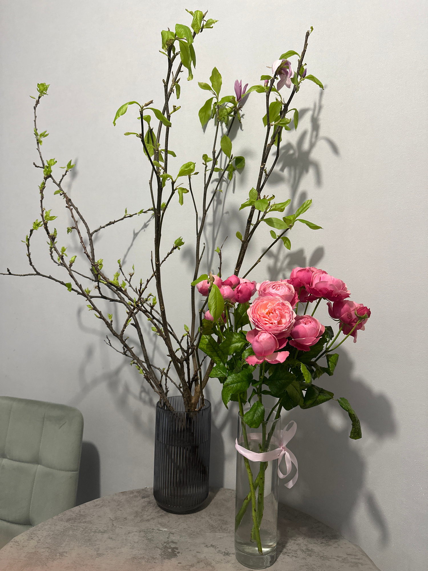 The image shows a floral arrangement with two vases. One vase is dark gray and ribbed, containing bare branches with nascent green leaves, and some branches with larger green leaves and a few purple f…read more
