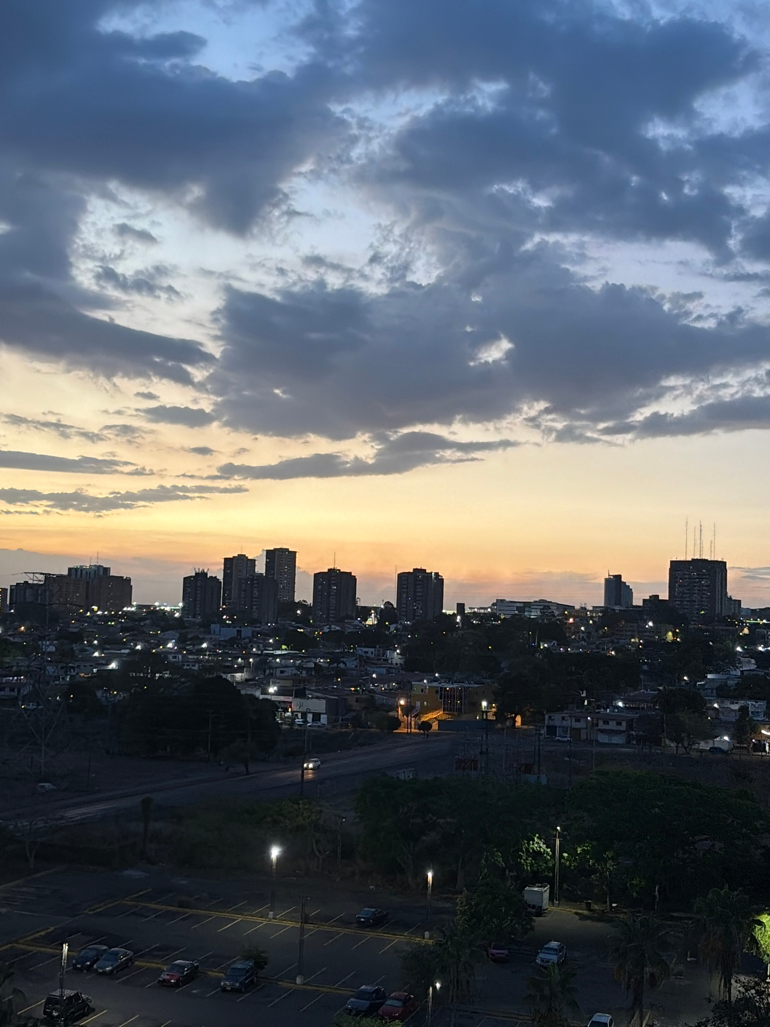 The image captures a twilight cityscape. On the right side, buildings and city infrastructure are visible with illuminated streets and parking lots containing vehicles. Trees dot the urban landscape.…read more