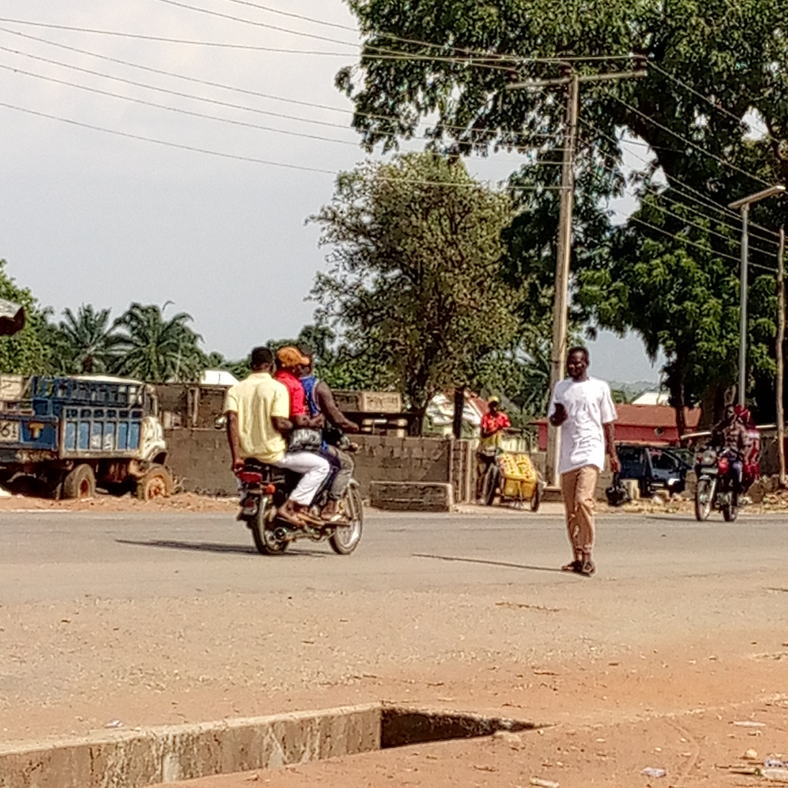The scene is in Mararaba, Nigeria. Three people are riding a motorcycle. A man in a white shirt and khaki pants is walking across a street, facing the camera. There is a blue truck on the left side of…read more