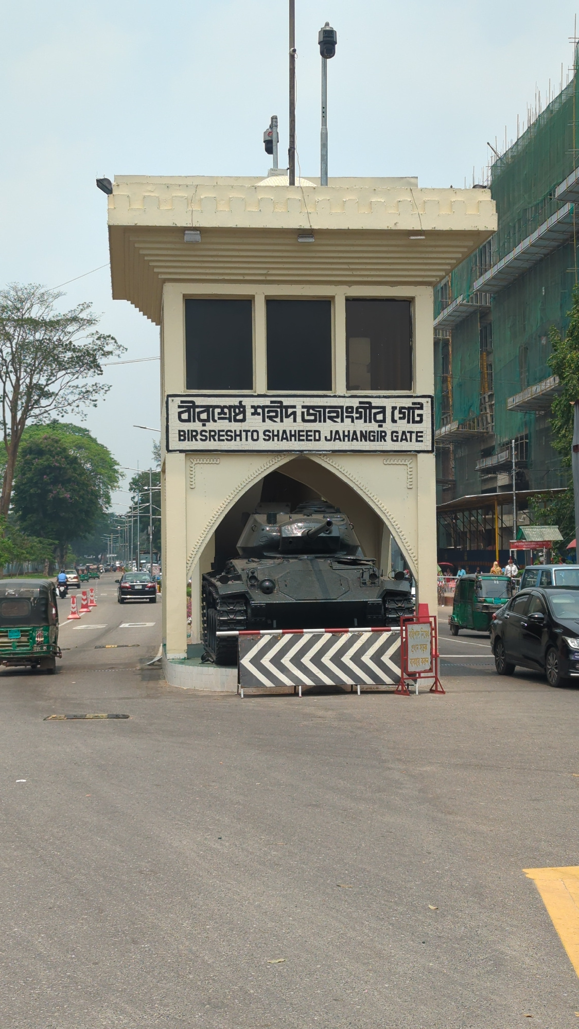 The image depicts Birshreshto Shaheed Jahangir Gate in Dhaka, Bangladesh. The gate, constructed of beige stone, straddles a road, with a black tank displayed within its arch. A sign in Bengali and Eng…read more
