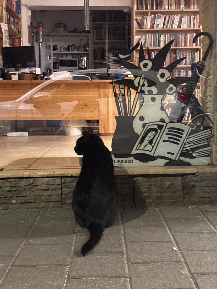 A black cat sits on a brick sidewalk next to a shop window displaying a black and white artistic image. Inside the shop, shelves of books are visible, along with a kitchen area with an oven and variou…read more