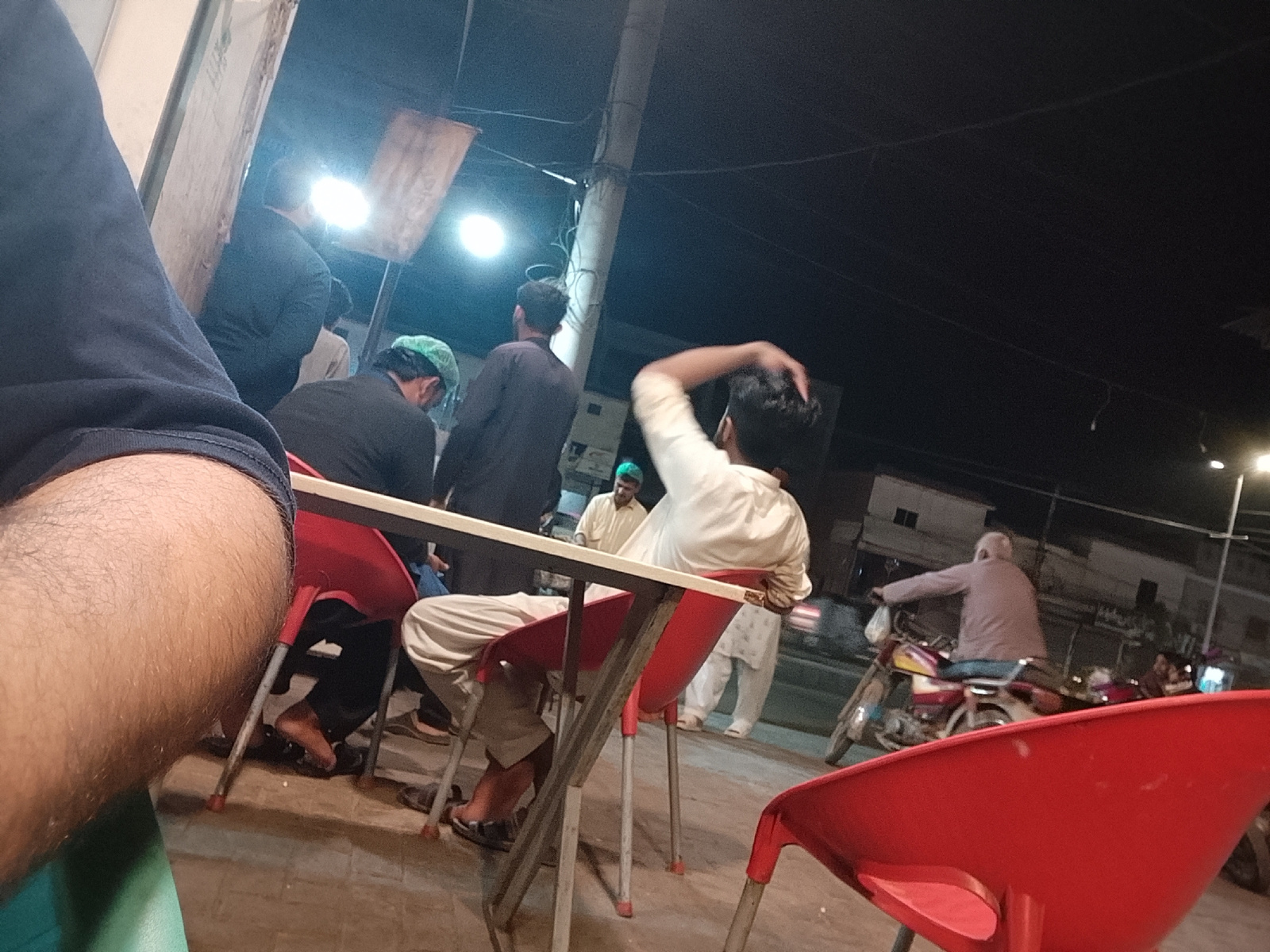 The image depicts an outdoor scene at night, likely a street-side eatery. Several men are present, some standing and others seated at tables with red plastic chairs. One man is seen rubbing the back o…read more