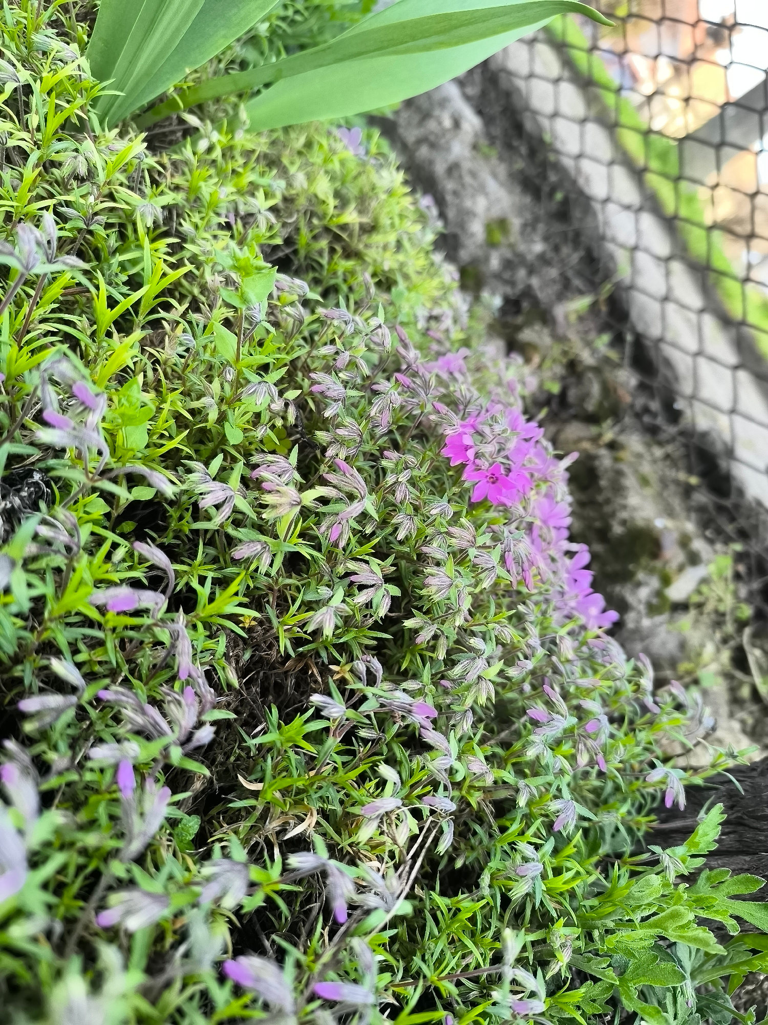 The image depicts a close-up view of flowering plants growing near a fence, likely in a garden or cultivated area. The main plants appear to be creeping phlox (Phlox subulata) or a similar species, chβ¦read more