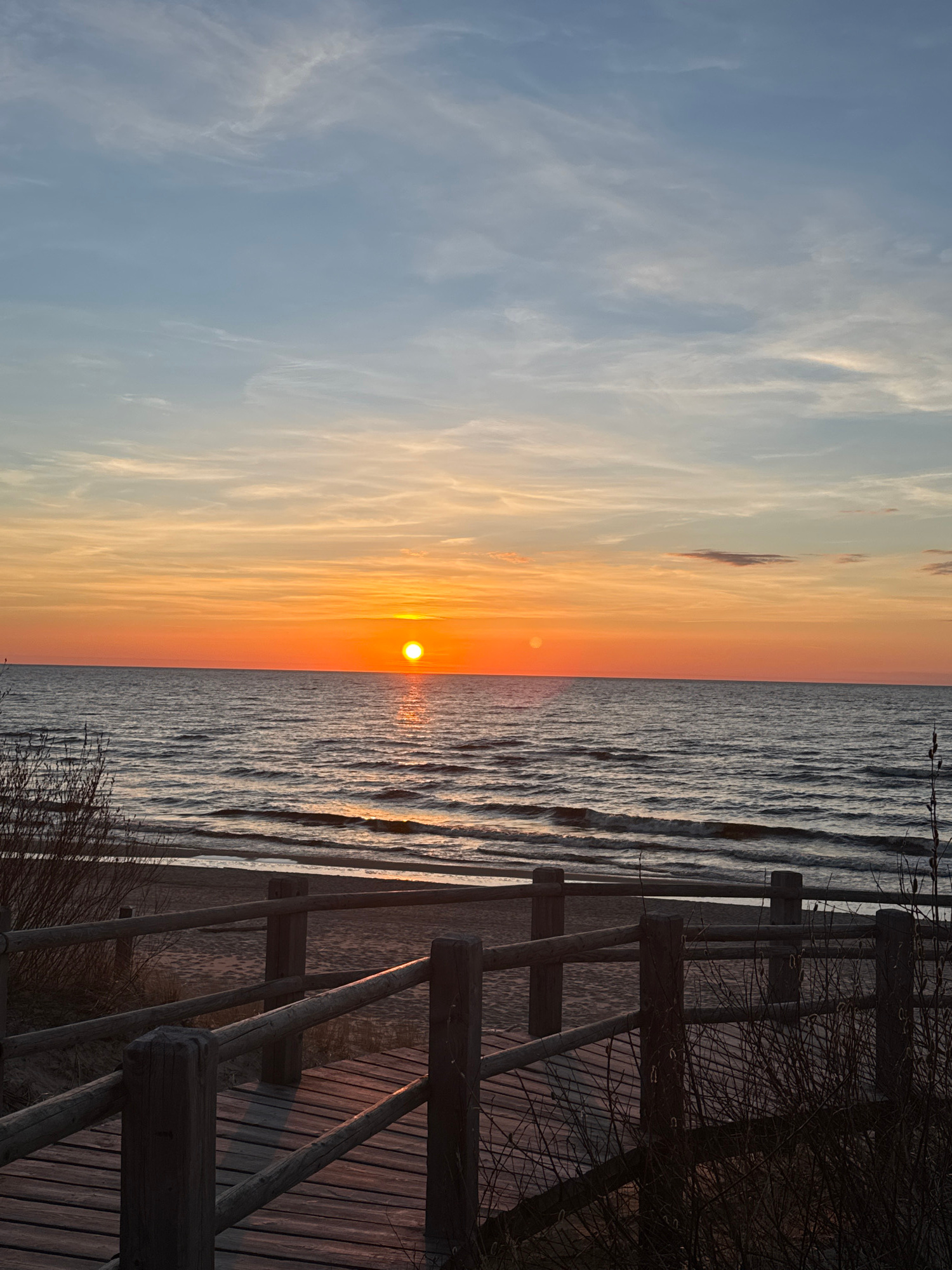 The image captures a sunset scene at the beach in Carnikava, Latvia. The sun is positioned on the horizon, creating a gradient of colors from light blue to orange and red in the sky. The sun's reflect…read more