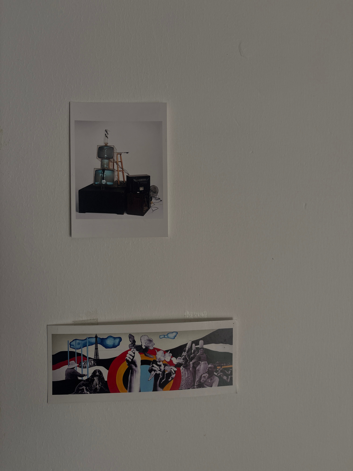 Two artworks are hung on a white wall. The left artwork, a square print, depicts a stack of televisions and wooden supports, oriented sideways. The right artwork is a vertical rectangle featuring a co…read more
