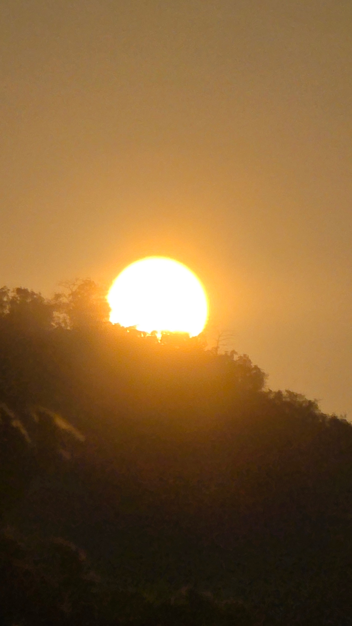 The image shows a bright sun partially obscured by a dark, densely vegetated hill or mountain in Bac Natural Heritage Area Trang, Vietnam. The scene is filled with a golden, hazy light. The sun is pos…read more