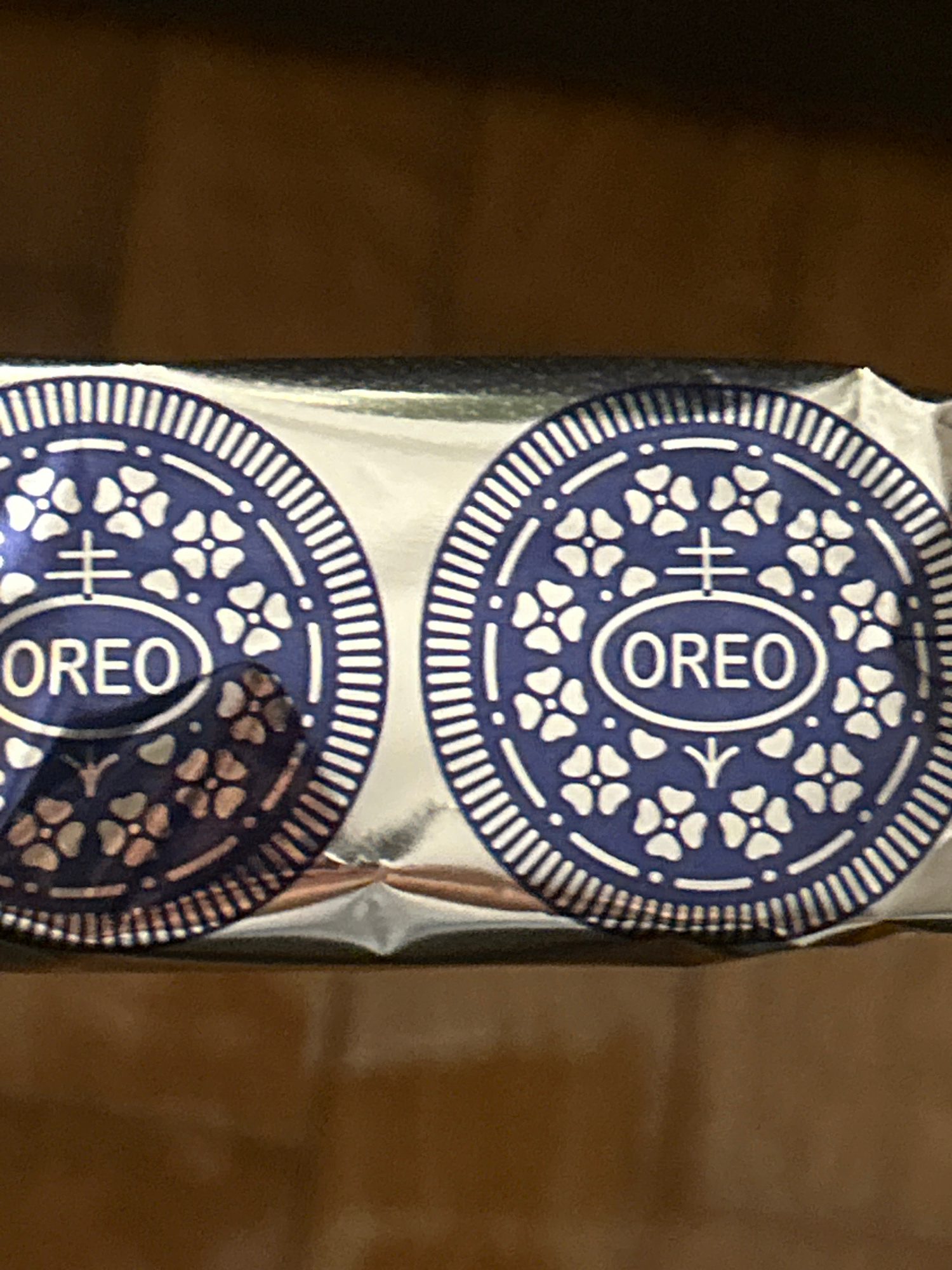 The image shows a vertically oriented, shiny silver package with two large, blue Oreo cookie designs. Each design features the word "OREO" in white lettering within a blue oval, surrounded by a patter…read more