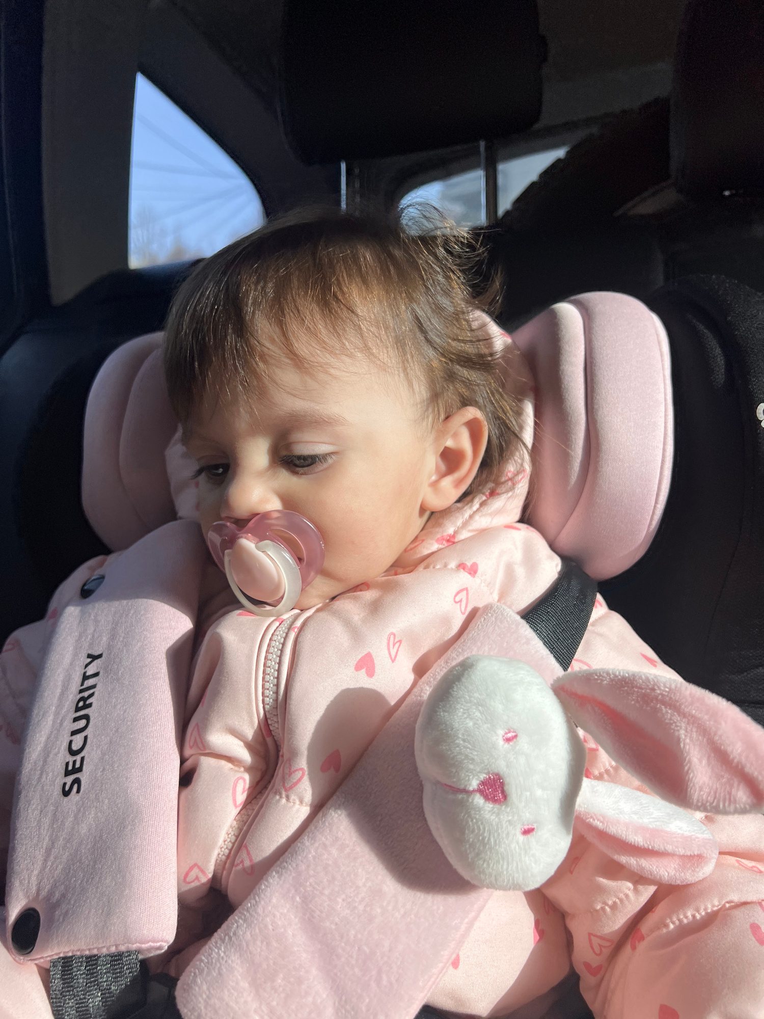 A baby rests in a car seat, wearing a pink outfit with small heart patterns. A pacifier is in the baby's mouth. A white plush bunny with pink accents rests against the baby's side. The car seat has a…read more
