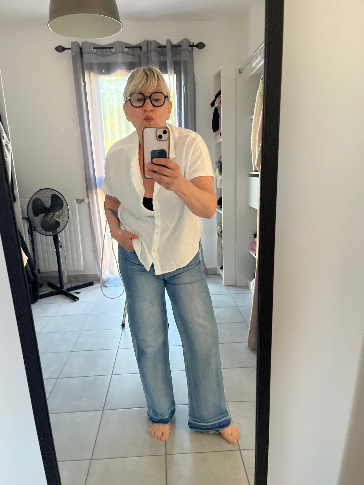 A woman is taking a selfie in a mirror. She is wearing glasses, a white shirt, and blue jeans. She is standing barefoot on a tiled floor. In the background is a window with curtains, a radiator, a fan…read more