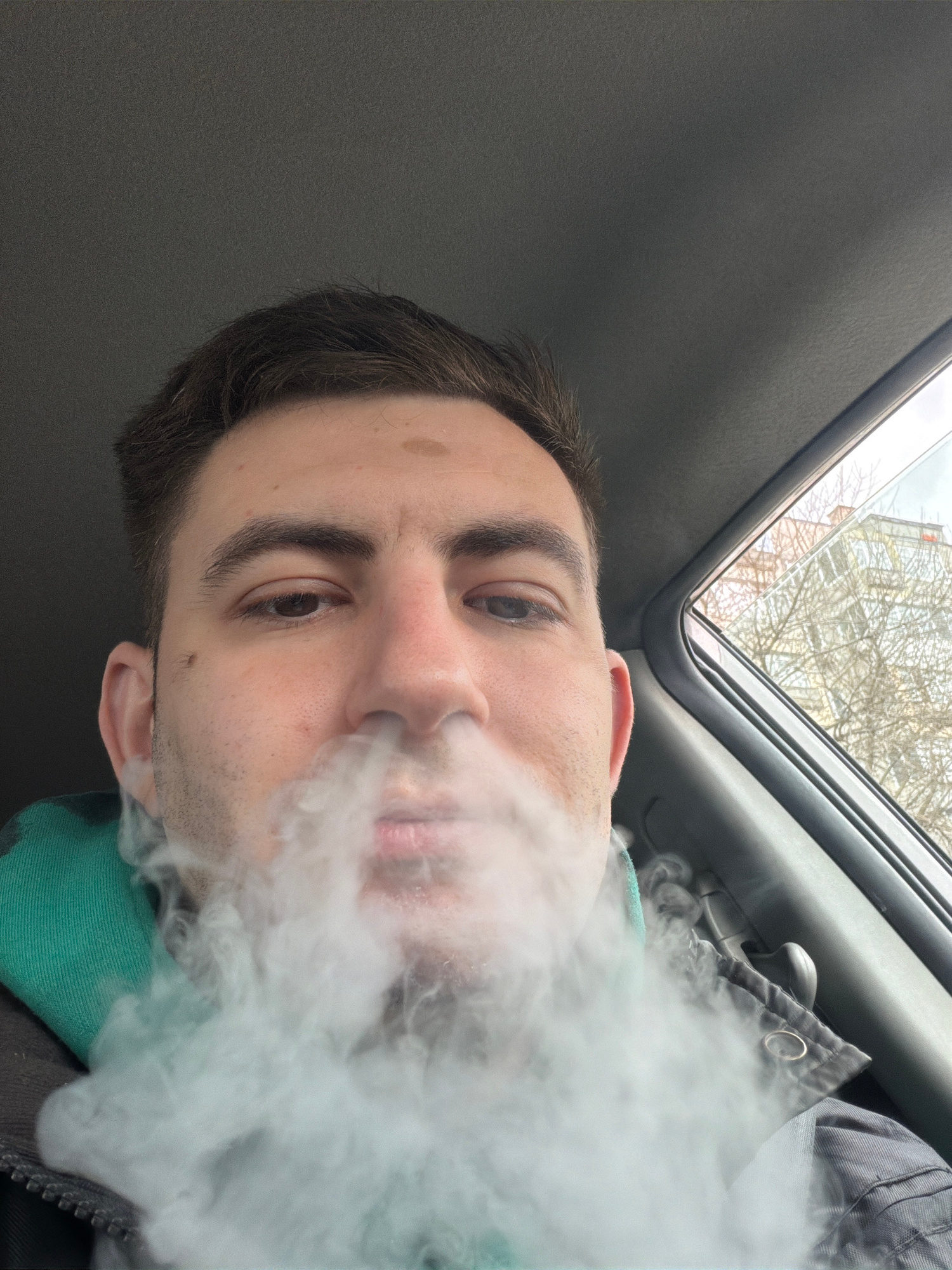A close-up photograph, rotated counter-clockwise, depicts a Caucasian male exhaling a large cloud of vapor. The man has short brown hair, brown eyes, and fair skin with a mole on his forehead. He is p…read more