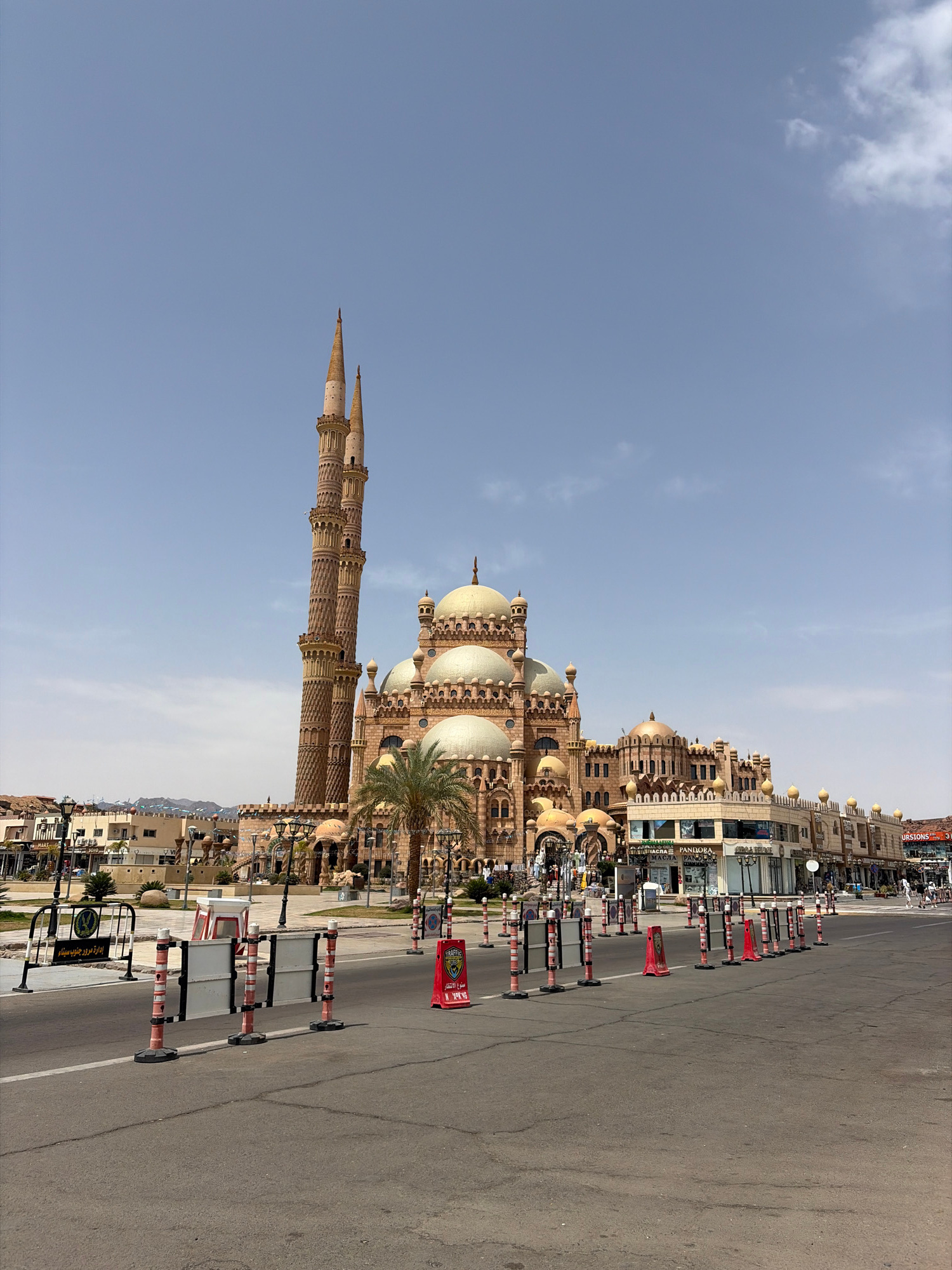 The image shows the Al-Mustafa Mosque in Sharm El Sheikh, Egypt. The mosque features a high minaret and multiple domes, constructed in a tan-colored stone. It is located next to a wide street with mul…read more