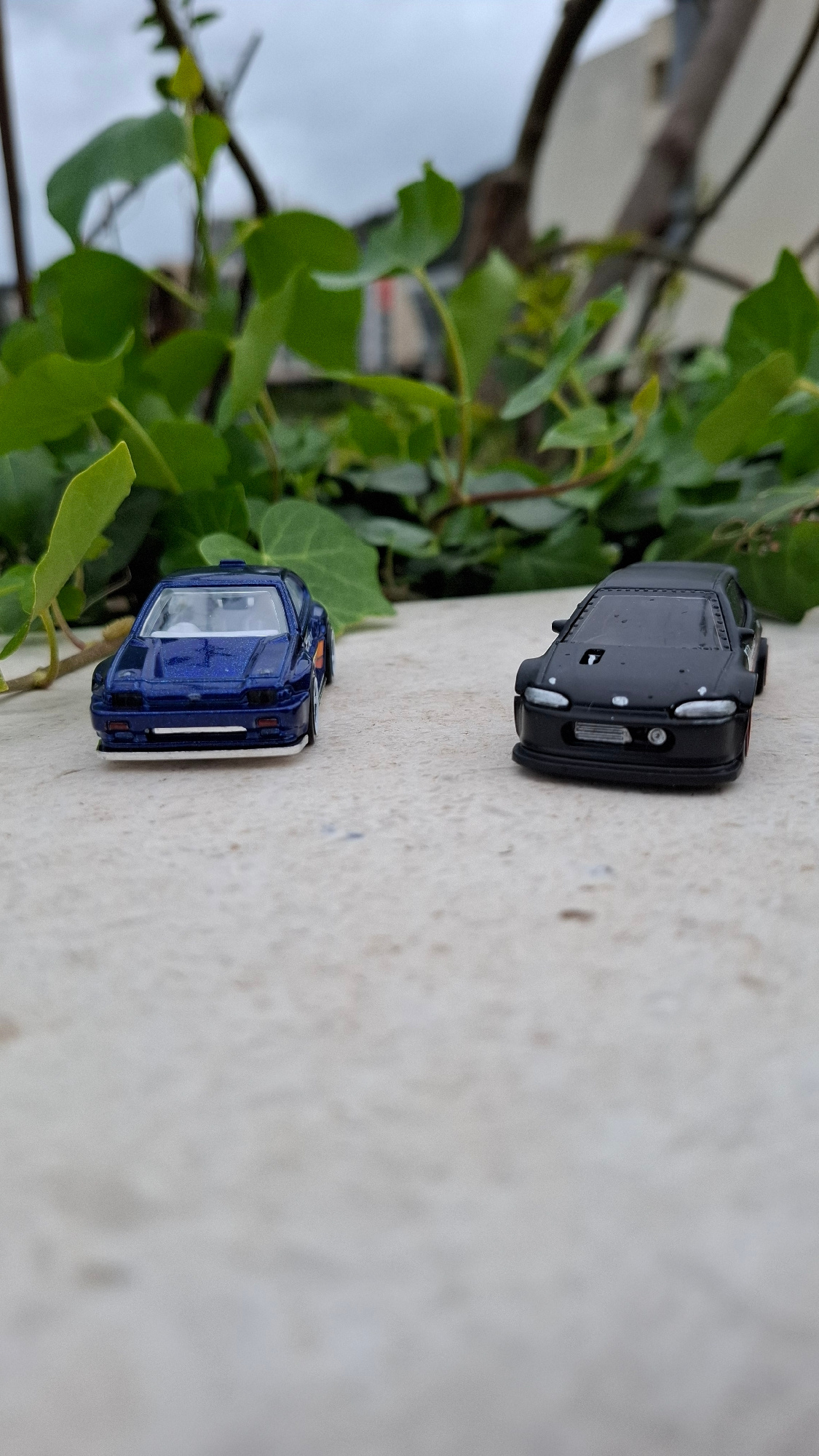 Two toy cars, one black and one blue, are positioned on a gray, textured surface, possibly concrete. The background features green leaves, and hints of a building in the distance suggest an urban sett…read more