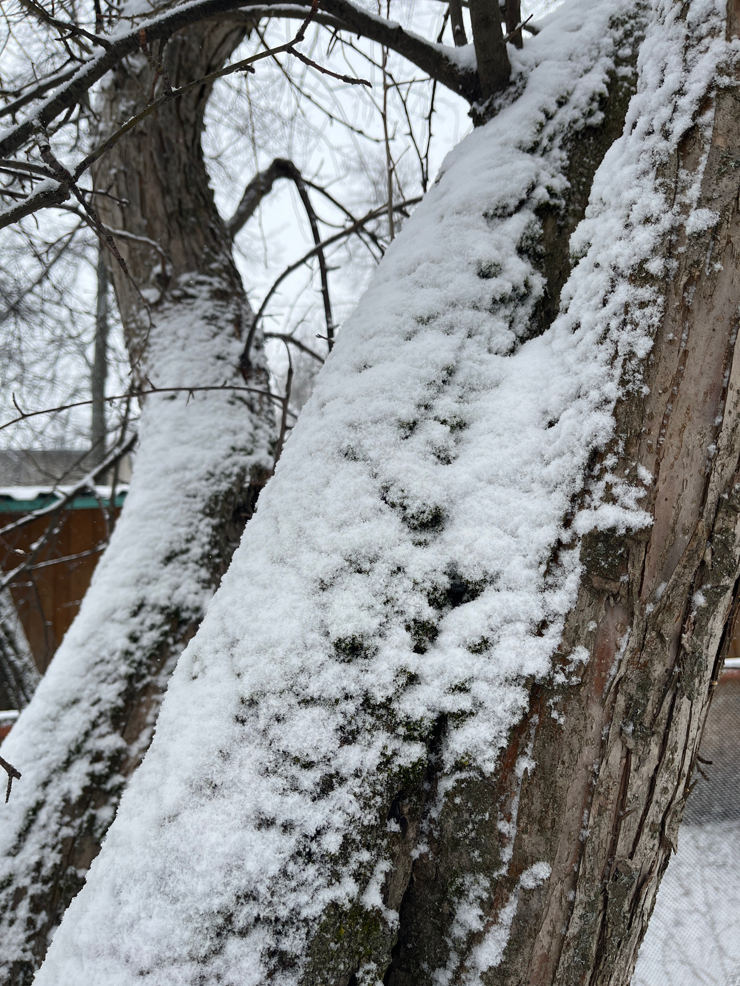 The image shows a tree branch covered in snow. The branch is horizontal in the foreground, with another branch extending diagonally downwards in the background. The tree bark is visible beneath the sn…read more